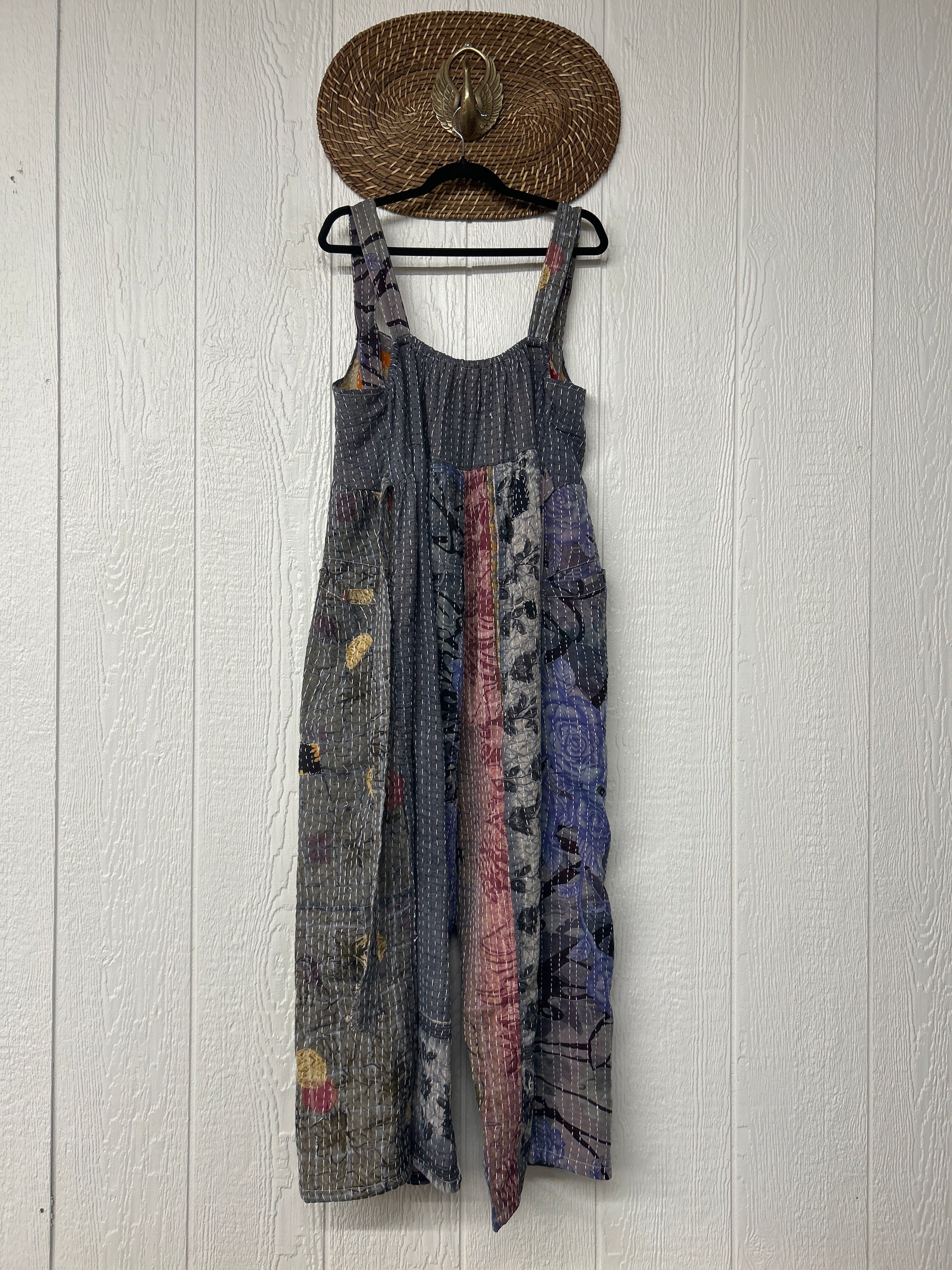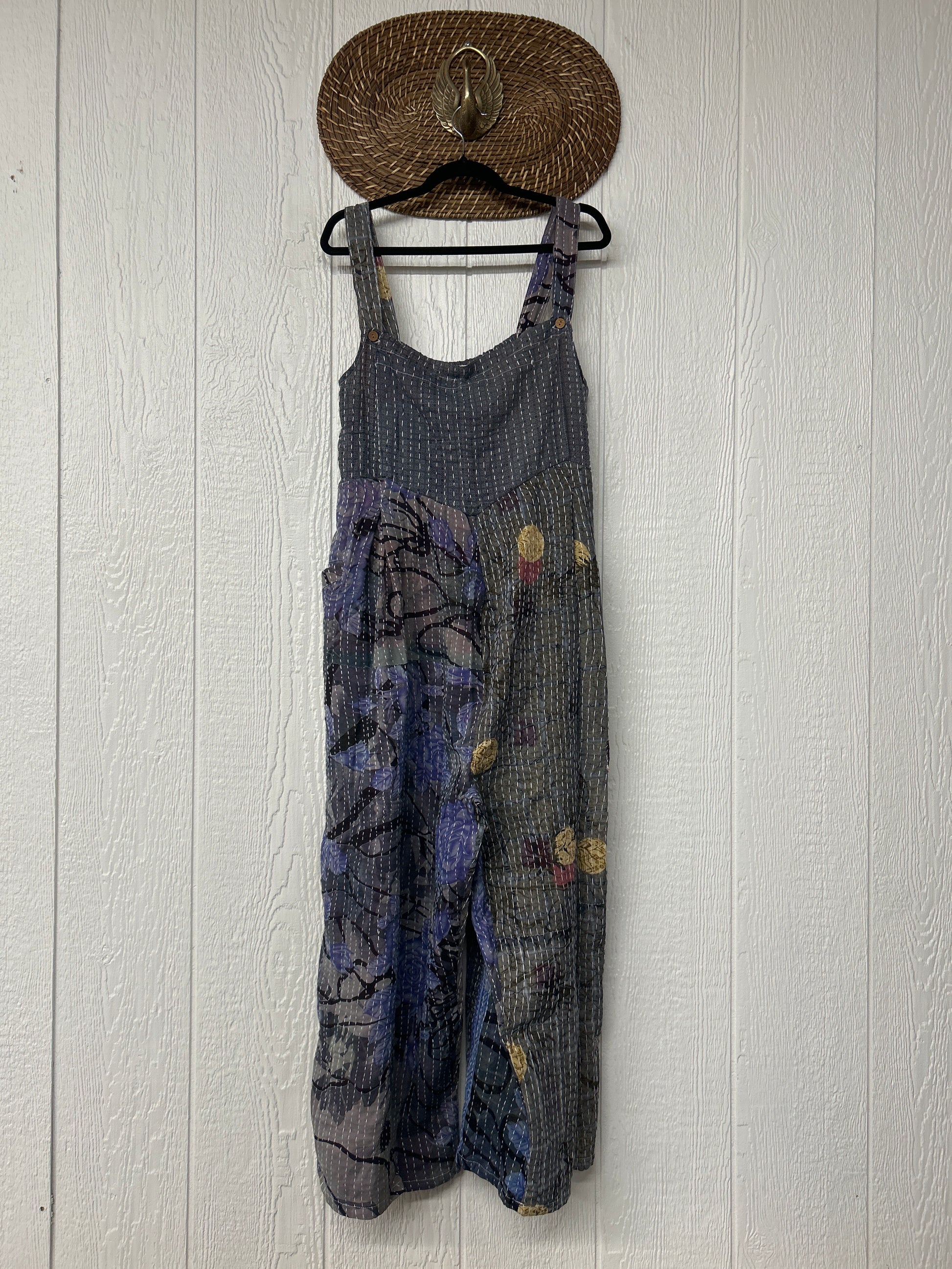 Features adjustable button straps, deep interior pockets, front bib pocket and wide flowy legs