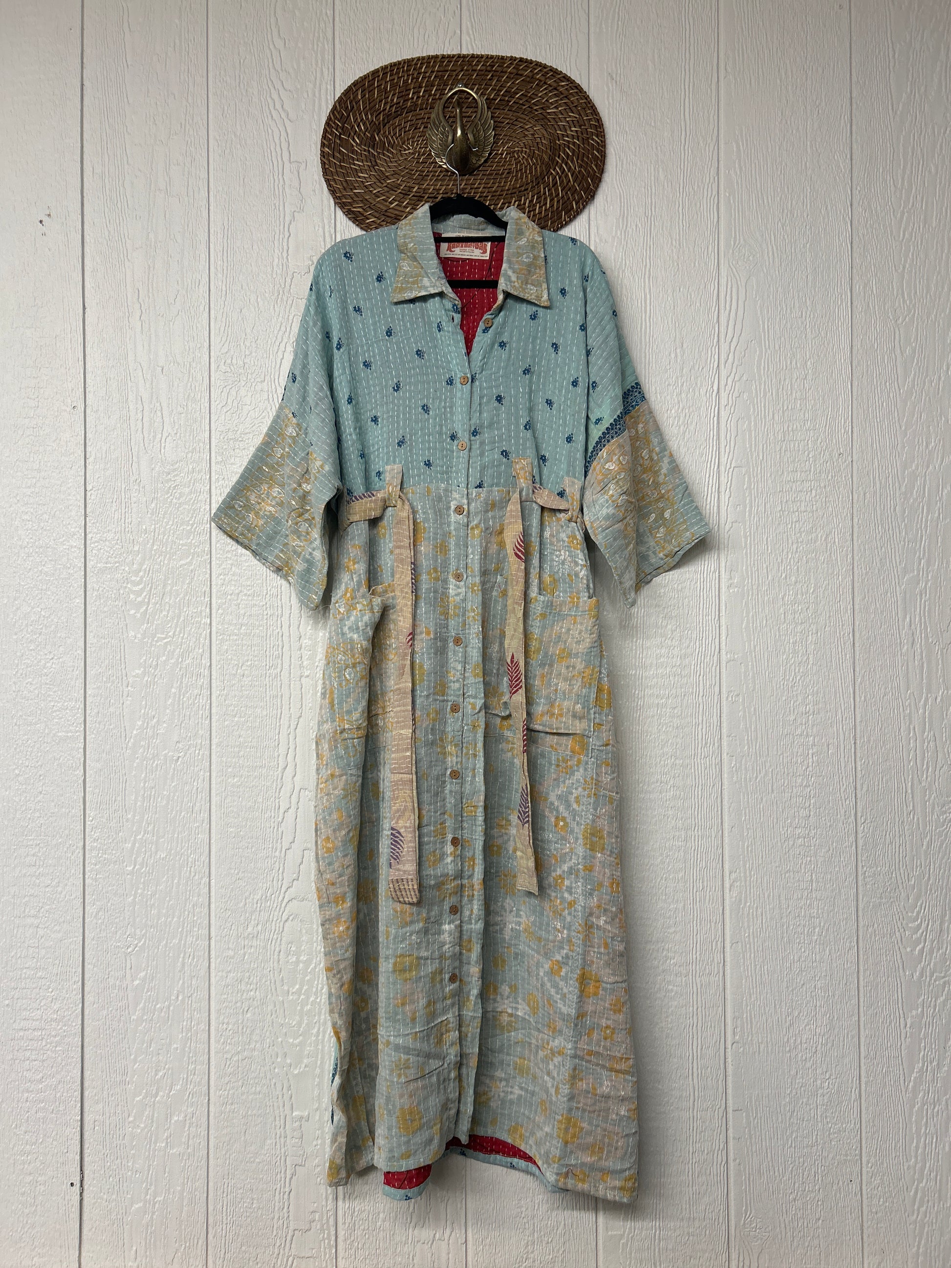 Crafted from our ultra-luxe Kantha stitch vintage cotton sari the Gravity Duster Dress features a button down front placket, adjustable belt.