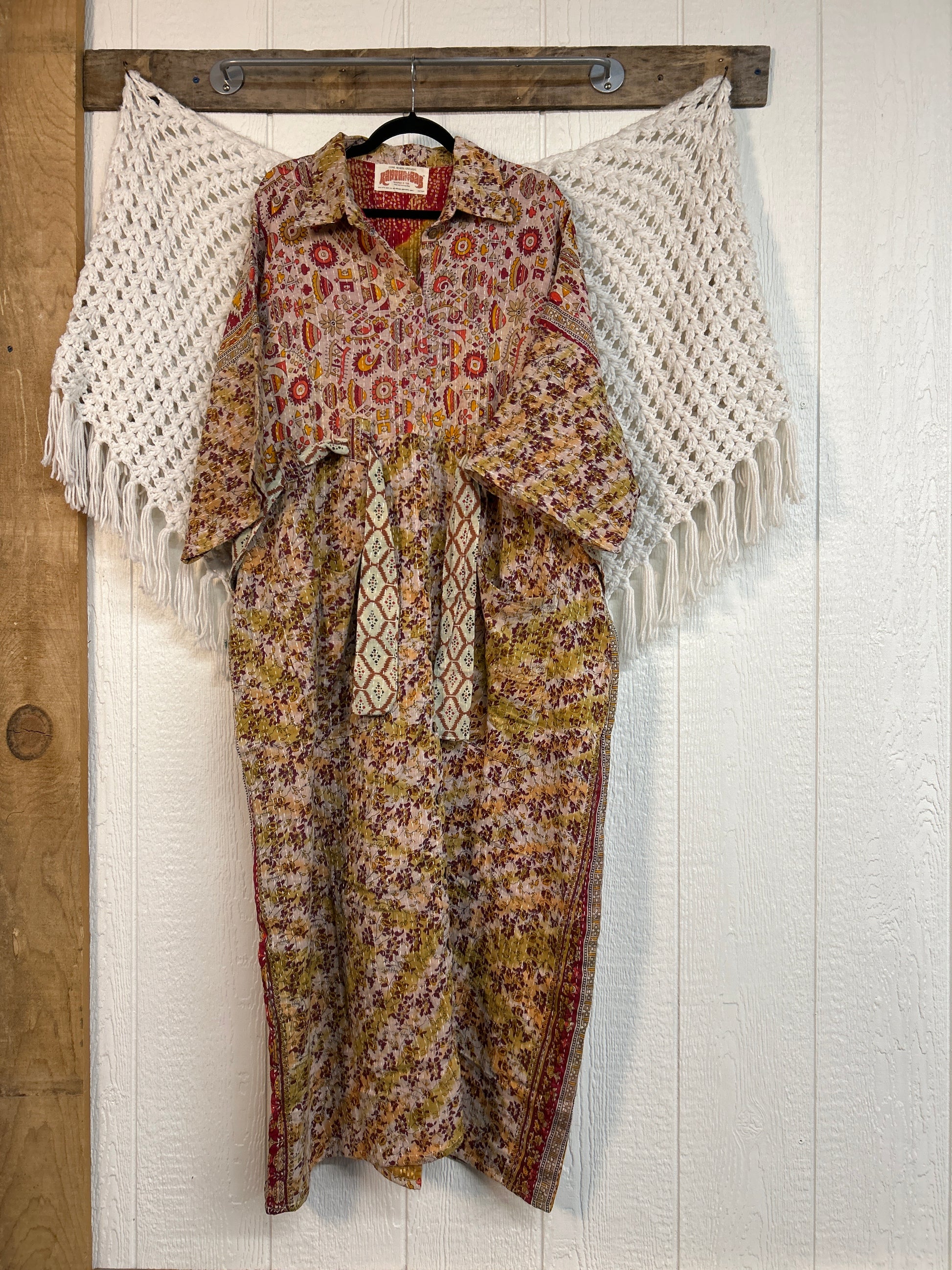 Crafted from our ultra-luxe Kantha stitch vintage cotton sari the Gravity Duster Dress features a button down front placket, adjustable belt.