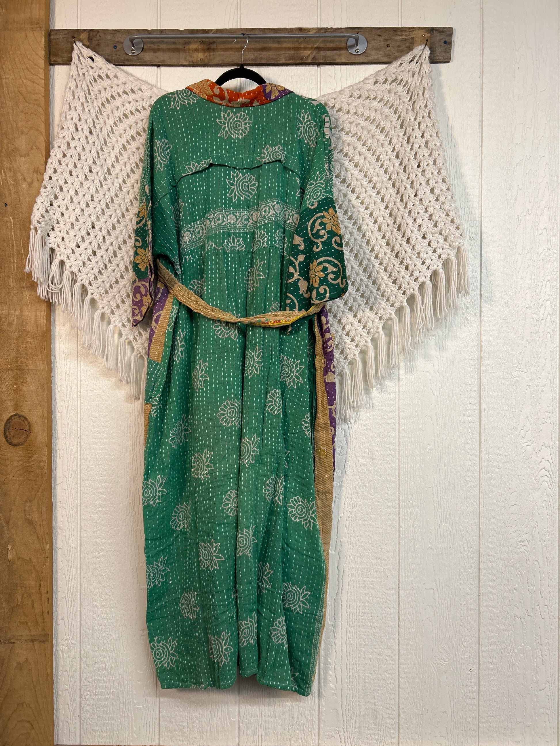 Crafted from our ultra-luxe Kantha stitch vintage cotton sari the Gravity Duster Dress features a button down front placket, adjustable belt.