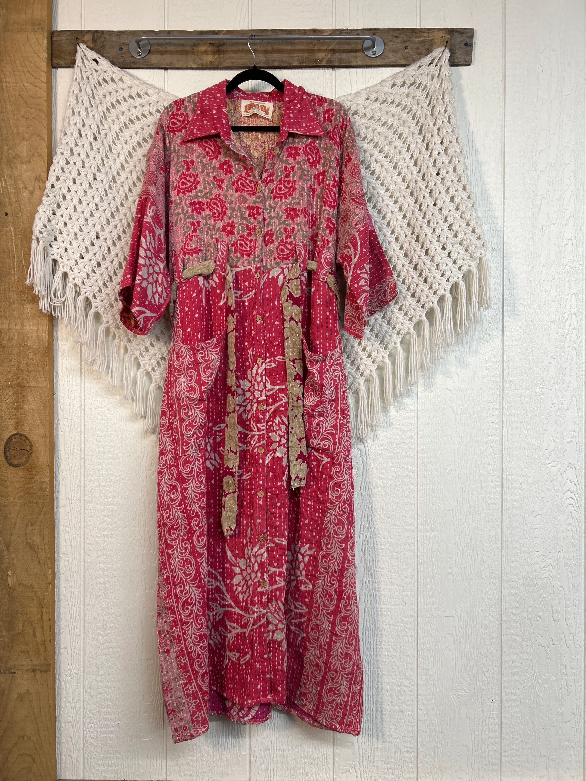 Crafted from our ultra-luxe Kantha stitch vintage cotton sari the Gravity Duster Dress features a button down front placket, adjustable belt.