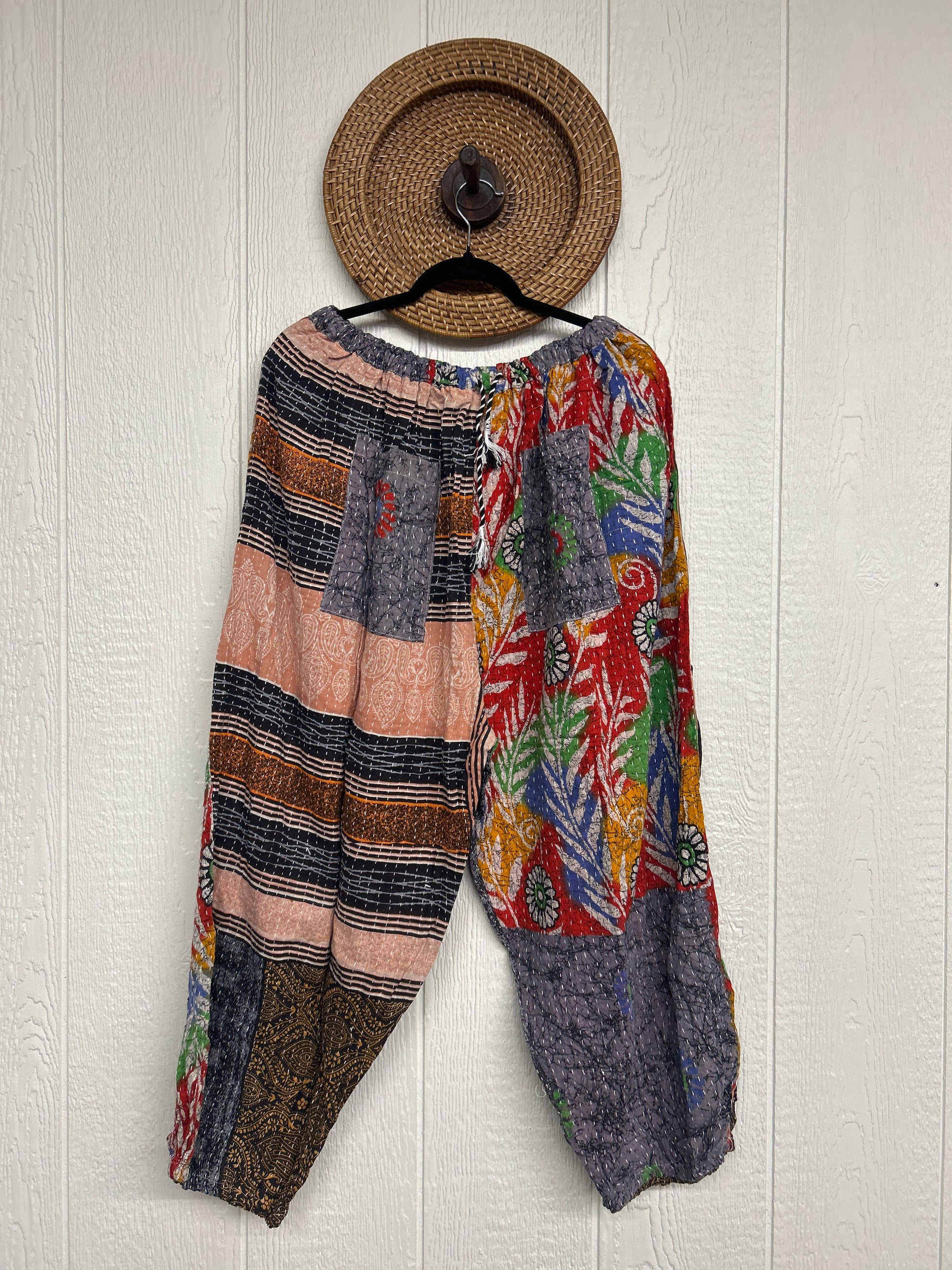 Crafted from luxe vintage kantha stitched cotton sari these chic kantha joggers feature two slouchy big exterior pockets and a thin elastic "jogger" opening at the leg . The waistband is magic and elastic featuring a drawstring for ultimate versatility.