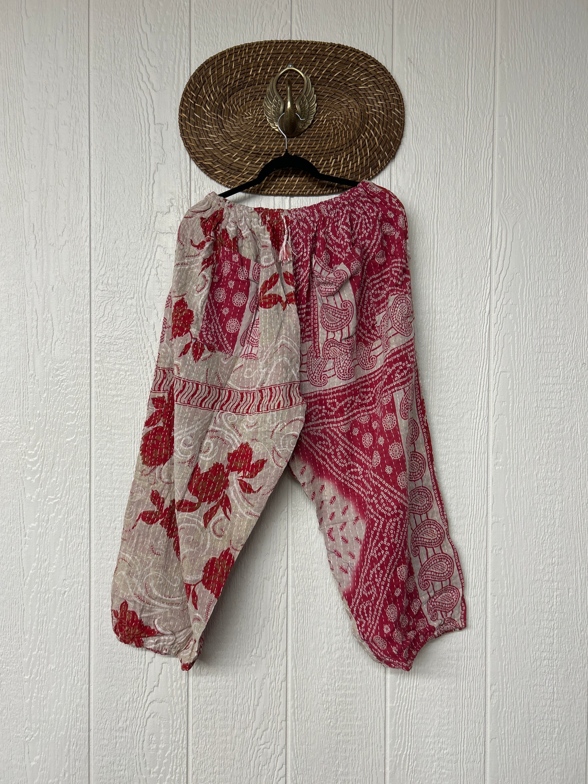 Crafted from luxe vintage kantha stitched cotton sari these chic kantha joggers feature two slouchy big exterior pockets and a thin elastic "jogger" opening at the leg . The waistband is magic and elastic featuring a drawstring for ultimate versatility.