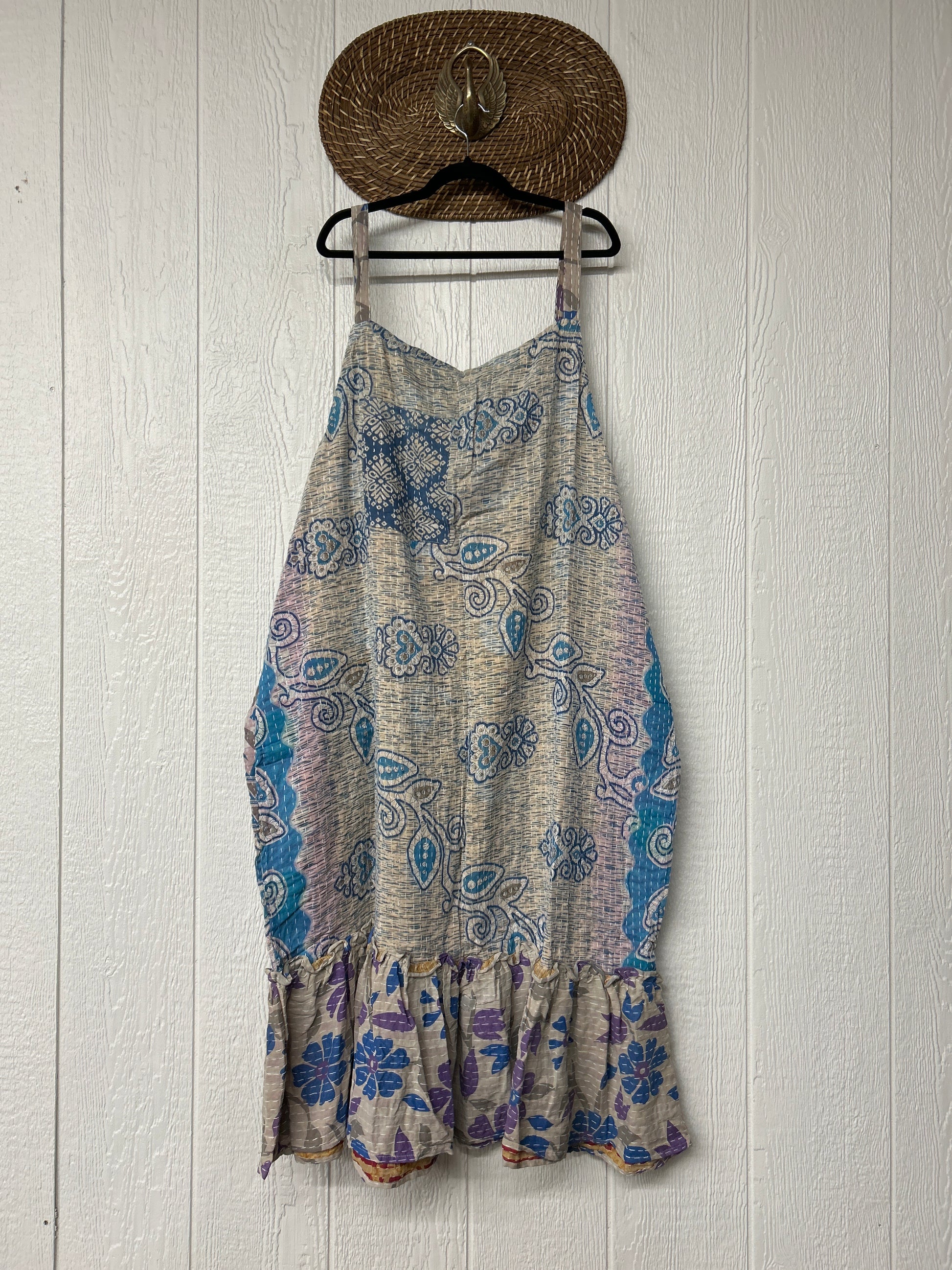 This groovy dream is made from our vintage cotton kantha sari. Crafted and sewn by families in a small village in Northern India providing work and a fair living. Disclosure: Our vintage styles have lived a full life before becoming the designs in our shop. Fabrics may have small threads or holes in the layers. Color inconsistency or small stains may be present.The saris are sewn together and extend the life of each design. Imperfections should be celebrated.