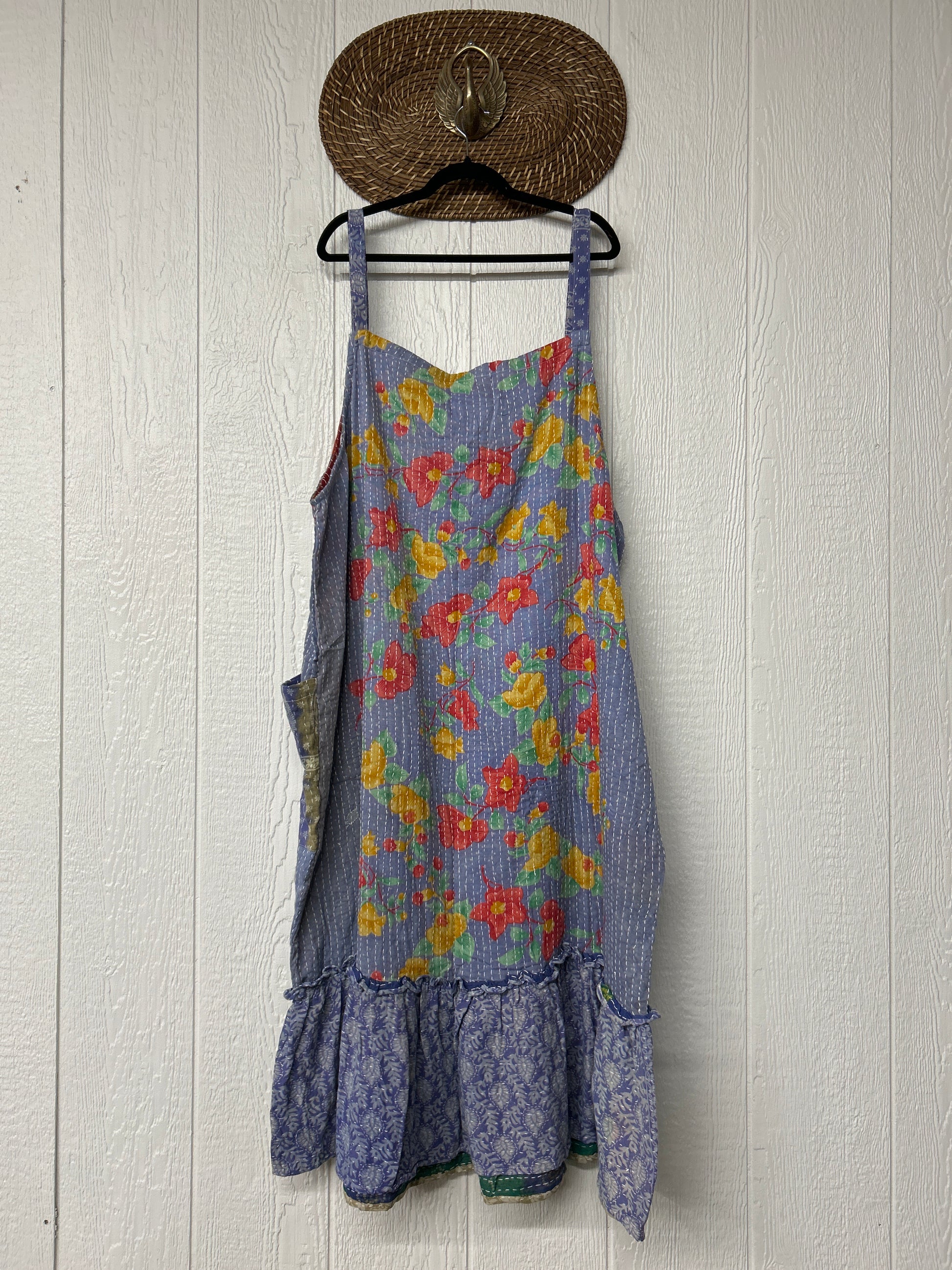 This groovy dream is made from our vintage cotton kantha sari. Crafted and sewn by families in a small village in Northern India providing work and a fair living. Disclosure: Our vintage styles have lived a full life before becoming the designs in our shop. Fabrics may have small threads or holes in the layers. Color inconsistency or small stains may be present.The saris are sewn together and extend the life of each design. Imperfections should be celebrated.