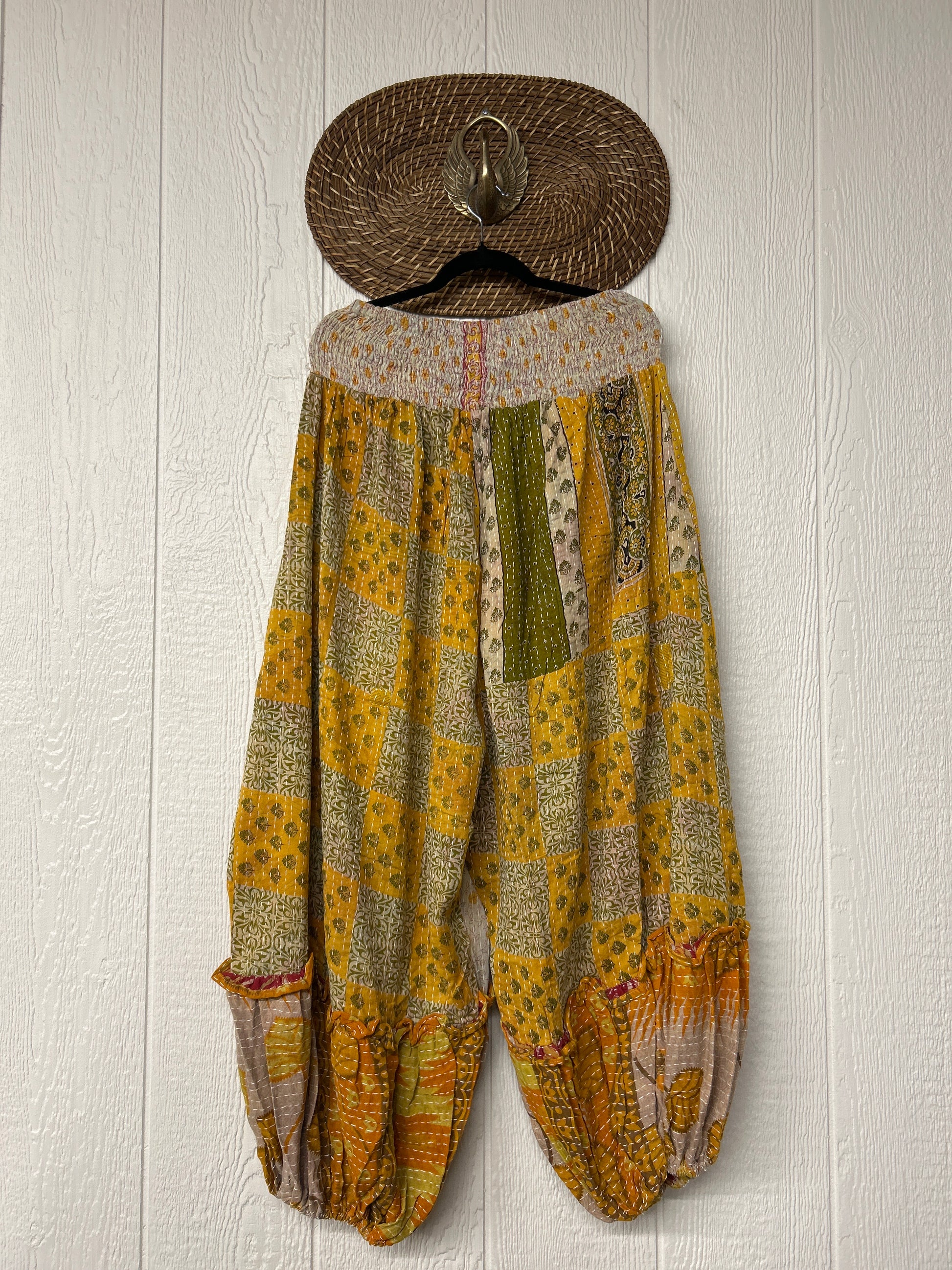 Crafted from our ultra lux kantha stitched vintage cotton sari these pants feature exterior slouchy pockets, a stretchy waistband and an elastic ankle opening. Dress these dream pants up or down to become the ultimate vibe!