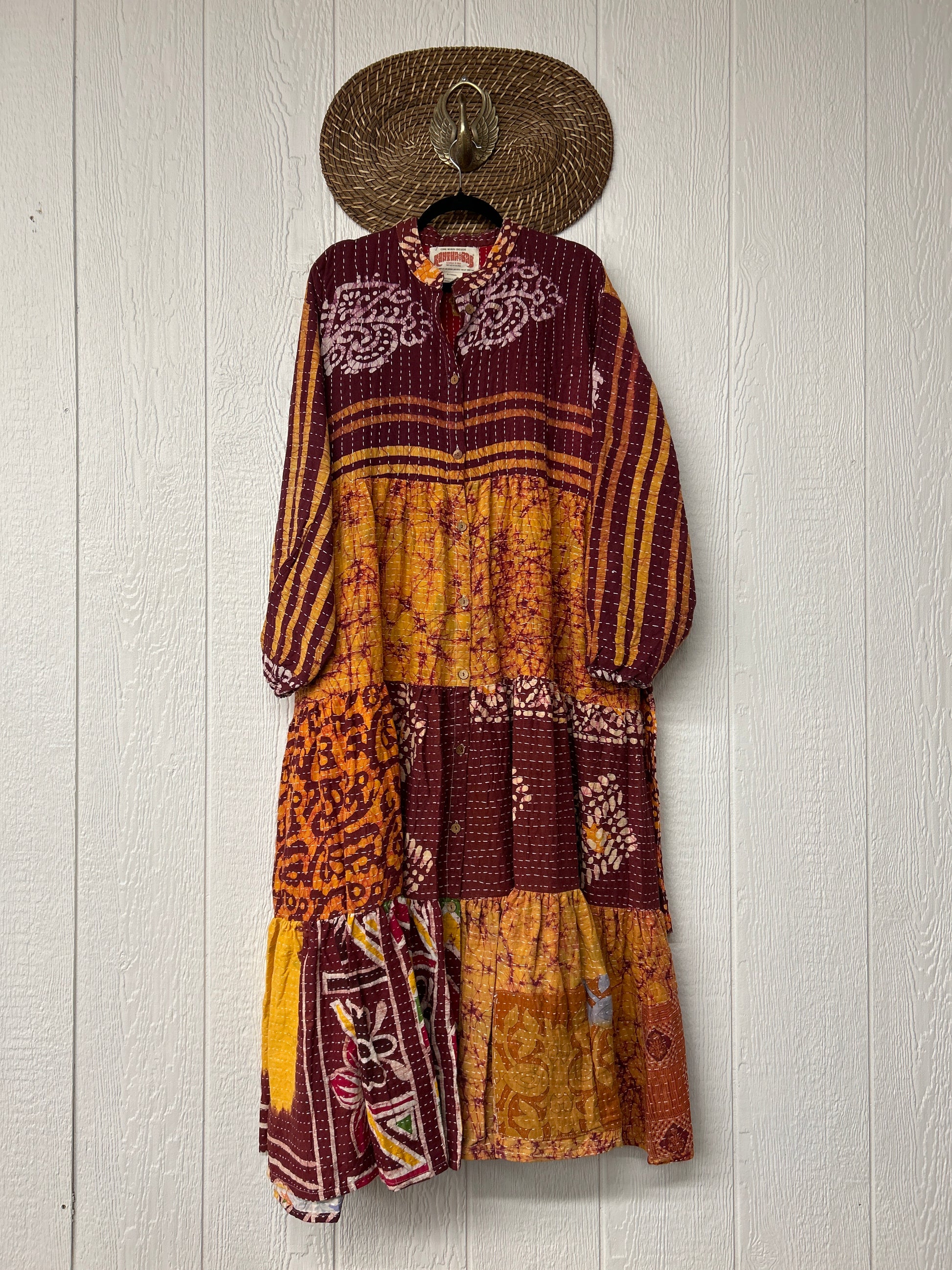 Disclosure: Our vintage styles have lived a full life before becoming the designs in our shop. Fabrics may have small threads or holes in the layers. Color inconsistency or small stains may be present. The saris are sewn together and extend the life of each design.