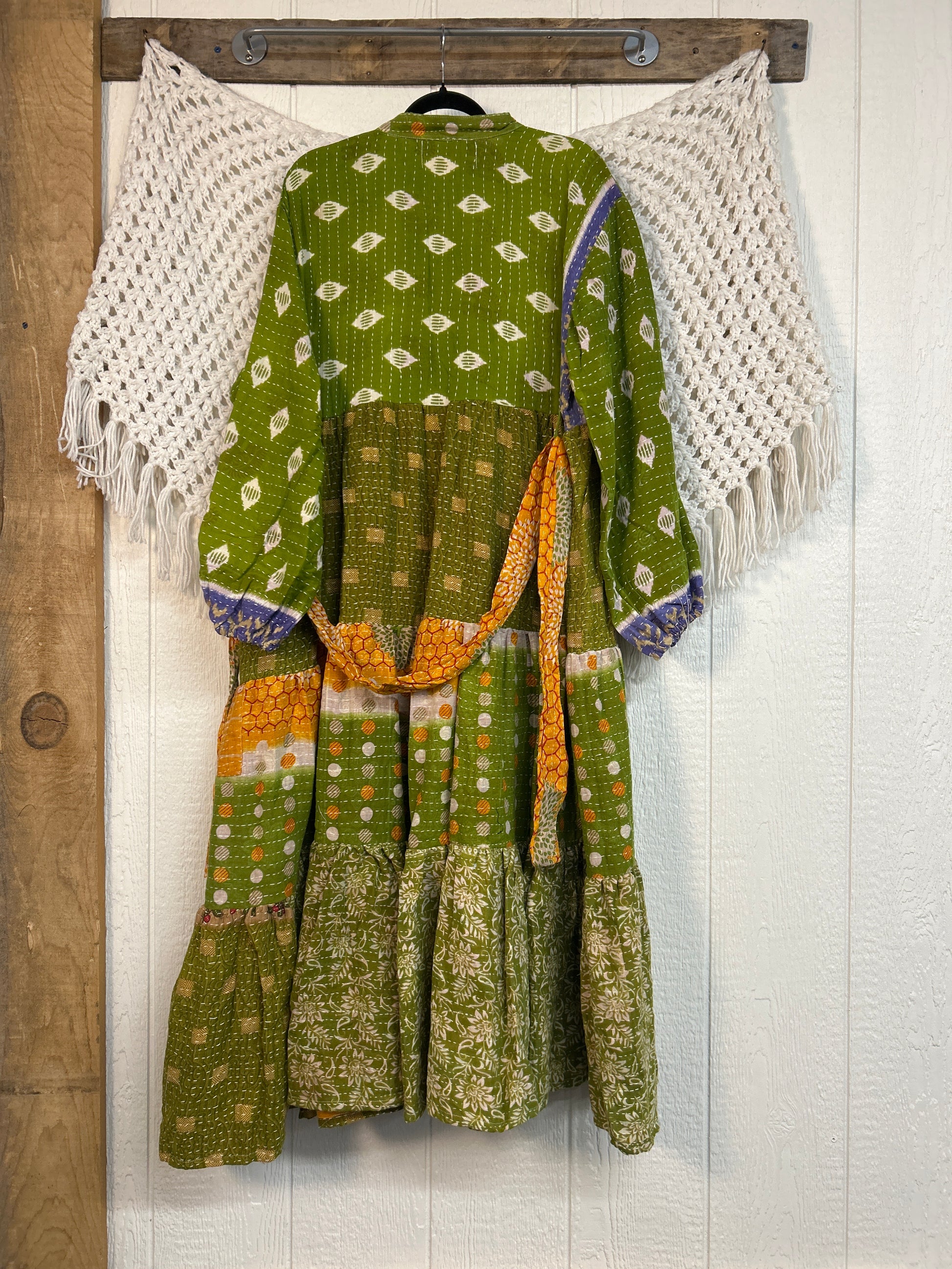 Disclosure: Our vintage styles have lived a full life before becoming the designs in our shop. Fabrics may have small threads or holes in the layers. Color inconsistency or small stains may be present. The saris are sewn together and extend the life of each design.