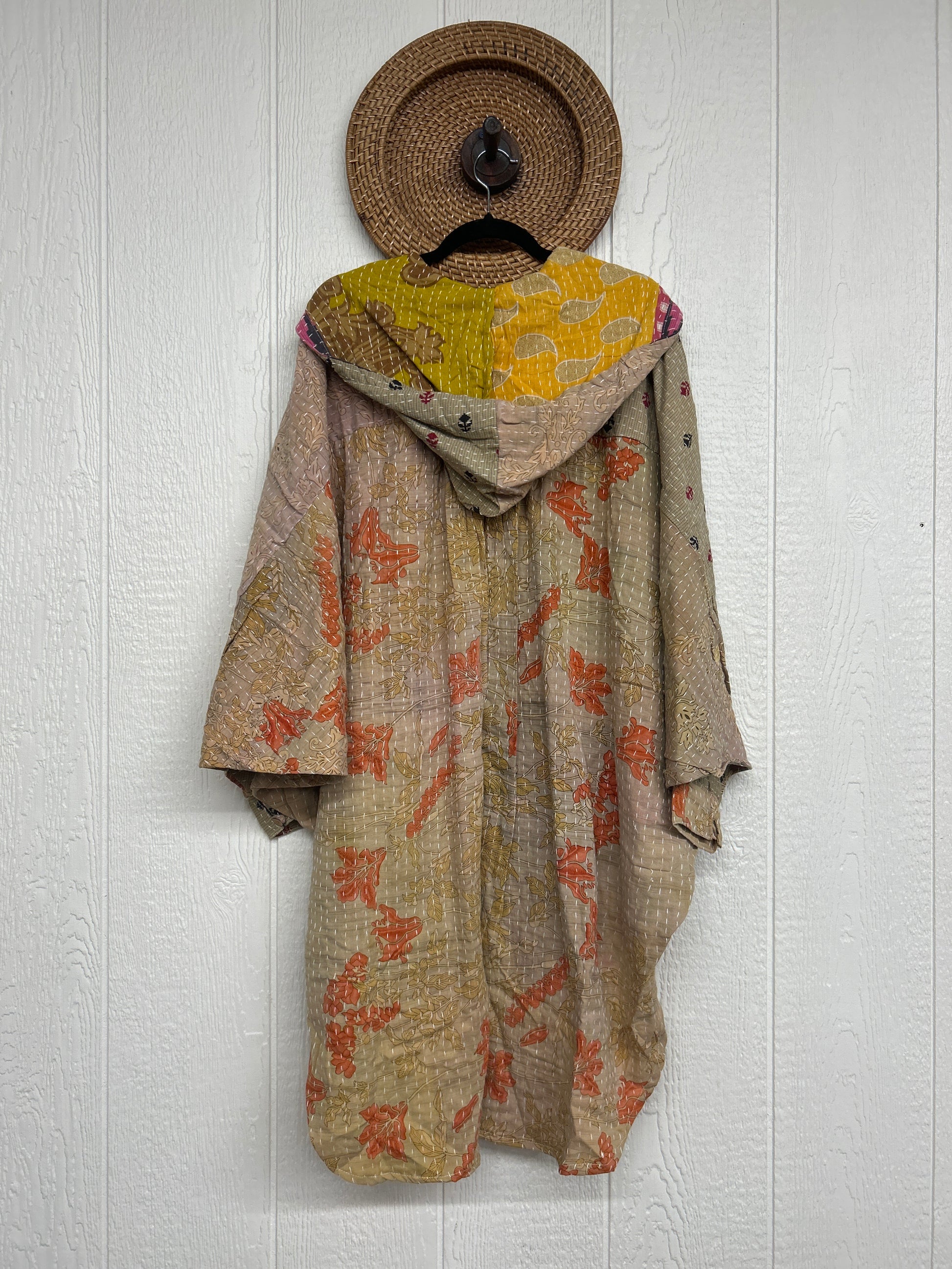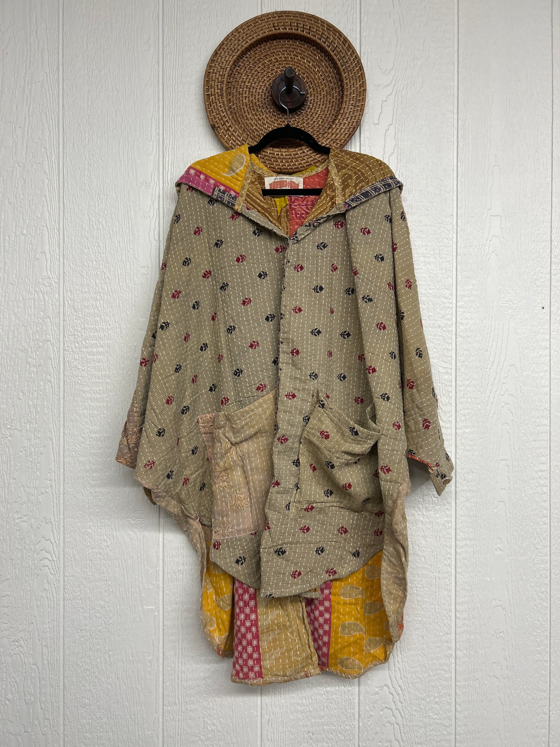 Made from our hand kantha stitched vintage cotton sari, this piece of wearable art features a Button-down opening with functional buttons, slouchy outer pockets, billowy sleeves, a rounded hemline and a vibey hood. The perfect top to compliment your favorite kantha pants or bell bottoms.