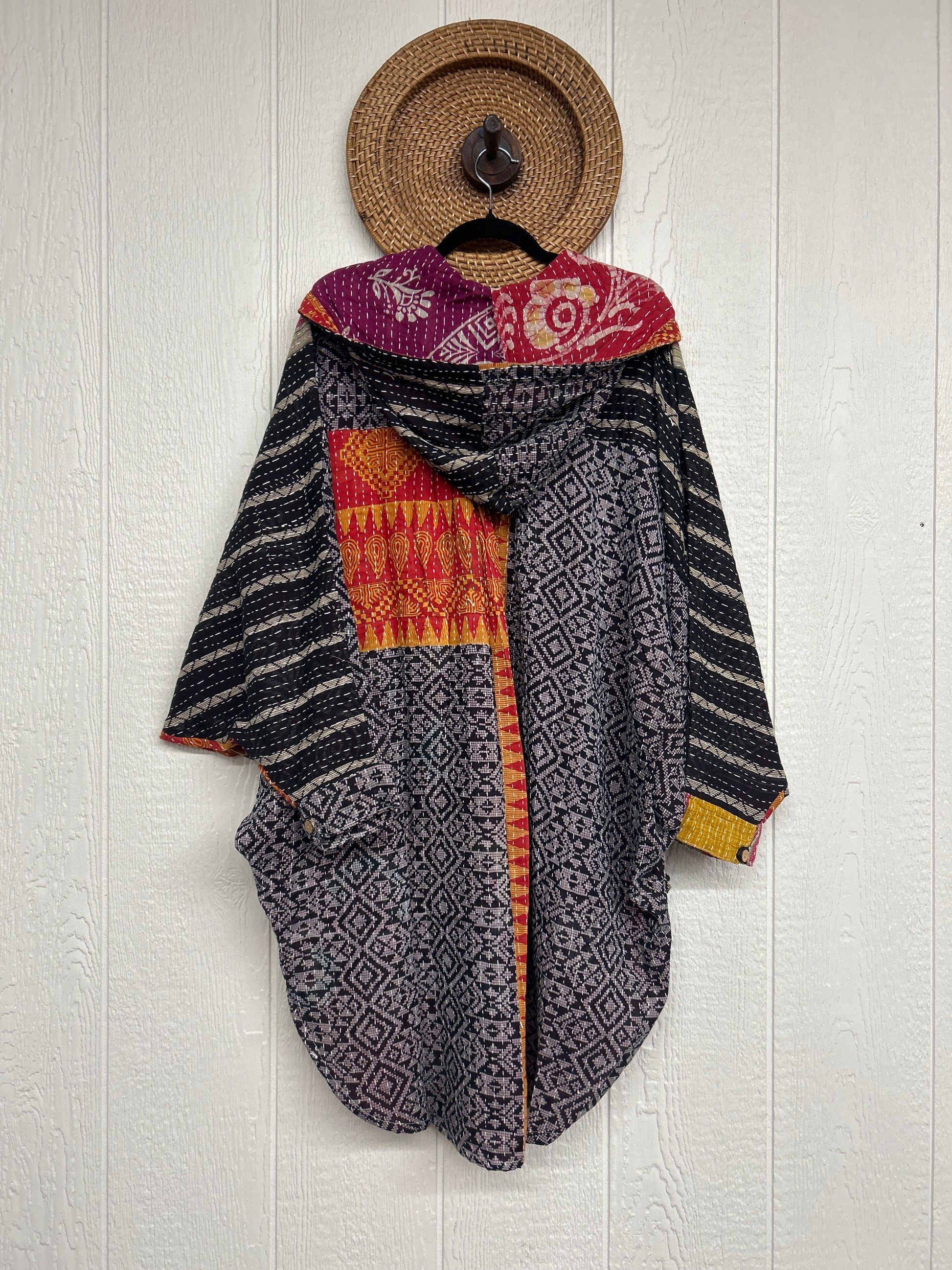 Made from our hand kantha stitched vintage cotton sari, this piece of wearable art features a Button-down opening with functional buttons, slouchy outer pockets, billowy sleeves, a rounded hemline and a vibey hood. The perfect top to compliment your favorite kantha pants or bell bottoms.