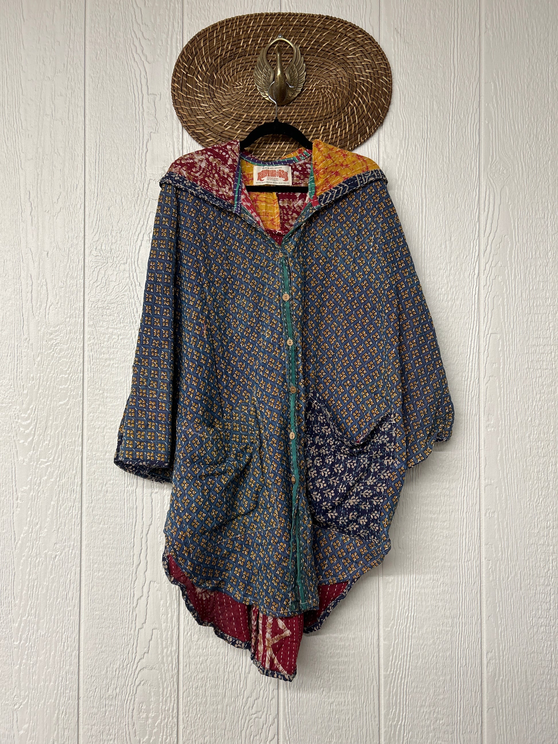 Made from our hand kantha stitched vintage cotton sari, this piece of wearable art features a Button-down opening with functional buttons, slouchy outer pockets, billowy sleeves, a rounded hemline and a vibey hood. The perfect top to compliment your favorite kantha pants or bell bottoms.