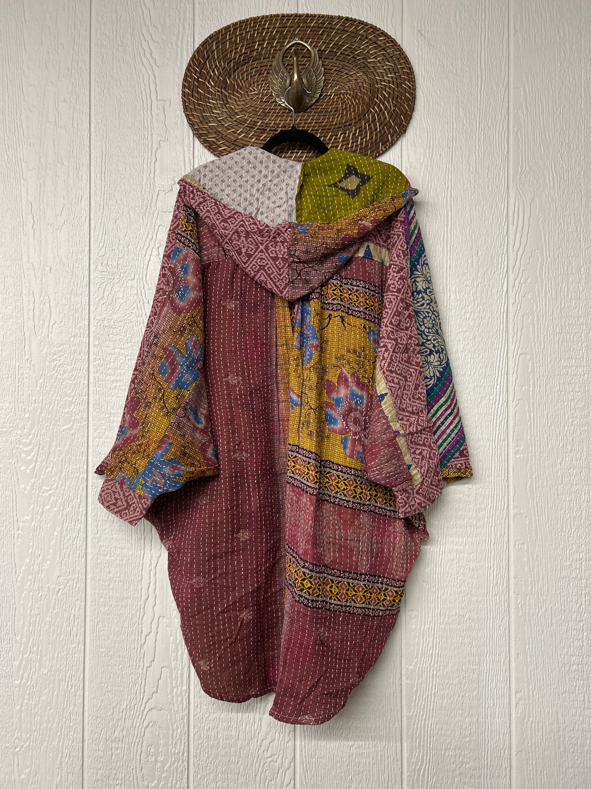 Made from our hand kantha stitched vintage cotton sari, this piece of wearable art features a Button-down opening with functional buttons, slouchy outer pockets, billowy sleeves, a rounded hemline and a vibey hood. The perfect top to compliment your favorite kantha pants or bell bottoms.