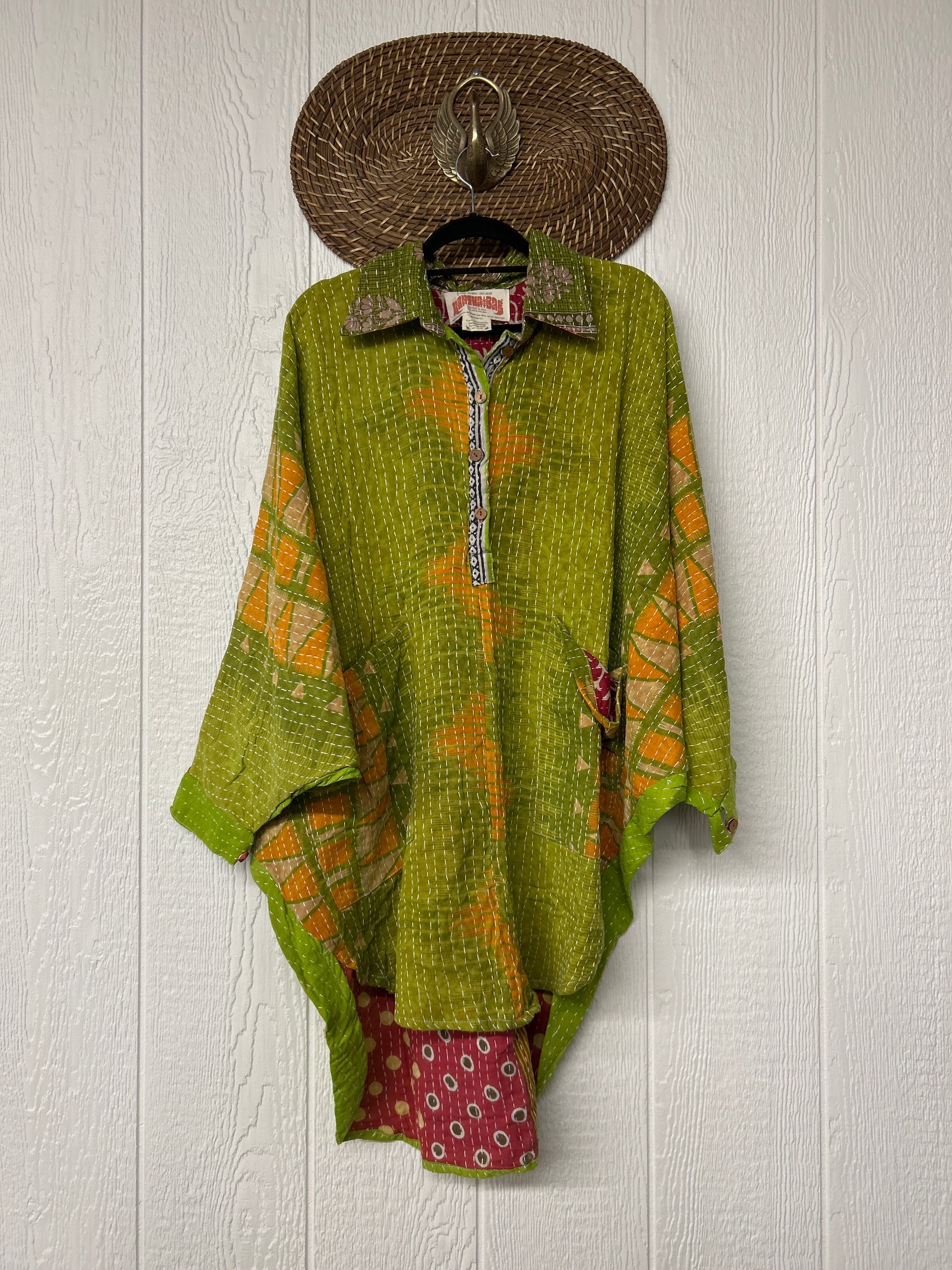 Made from our hand kantha stitched vintage cotton sari, this piece of wearable art features a henley neckline with functional buttons, slouchy outer pockets, billowy sleeves and a rounded hemline. The perfect top to compliment your favorite kantha pants or bell bottoms.