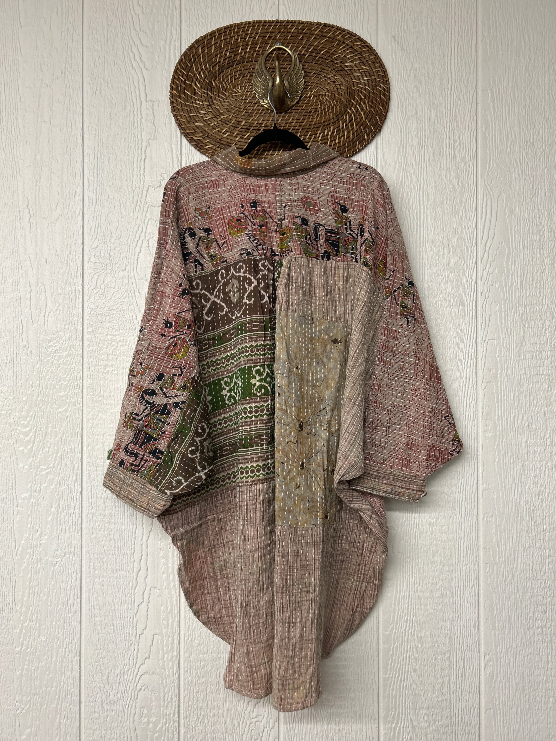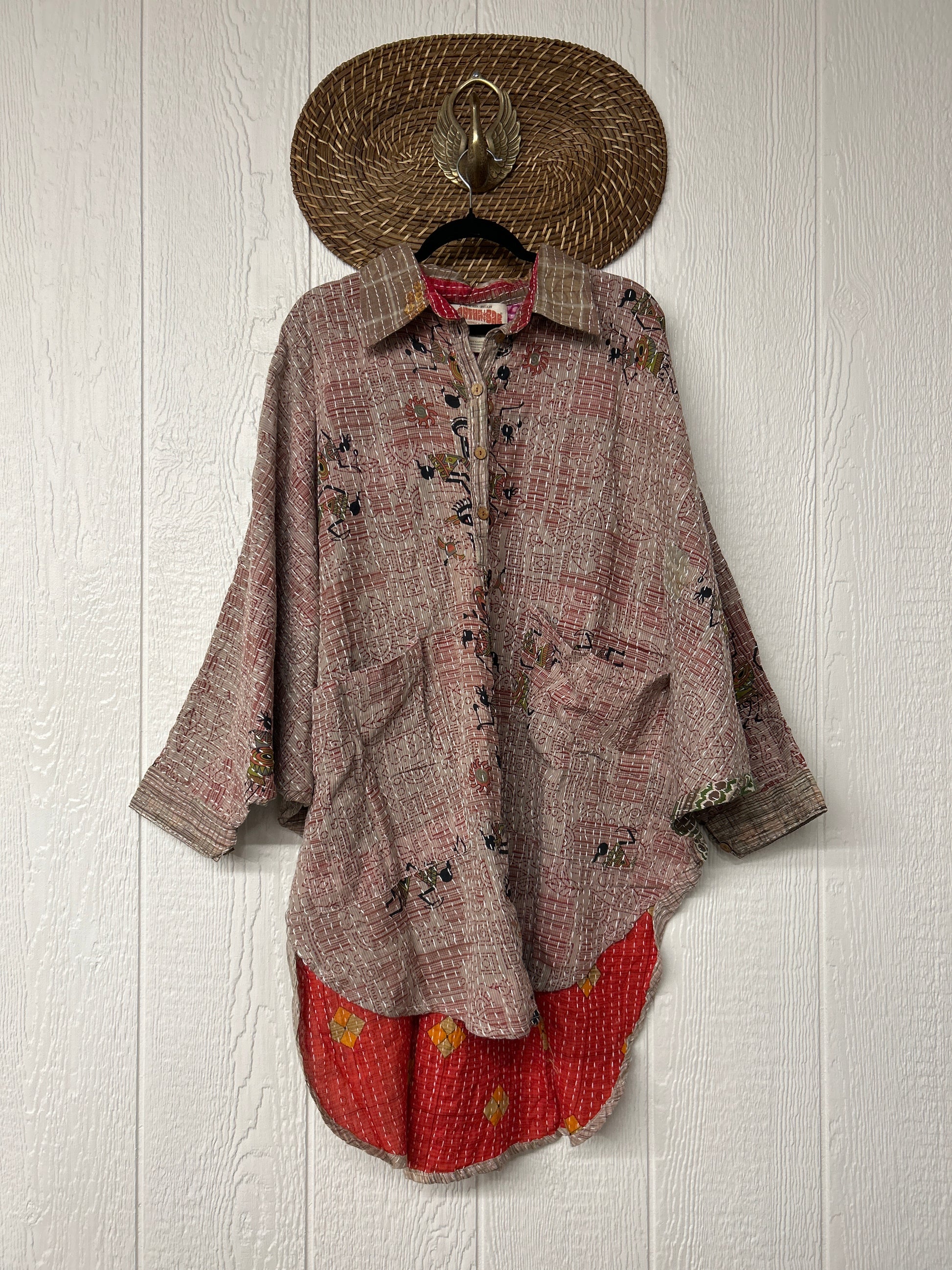 Made from our hand kantha stitched vintage cotton sari, this piece of wearable art features a henley neckline with functional buttons, slouchy outer pockets, billowy sleeves and a rounded hemline. The perfect top to compliment your favorite kantha pants or bell bottoms.
