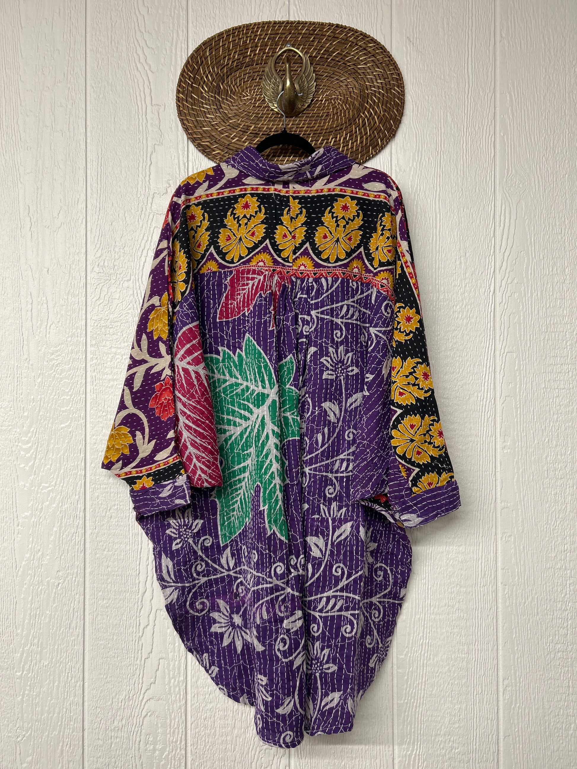 Made from our hand kantha stitched vintage cotton sari, this piece of wearable art features a henley neckline with functional buttons, slouchy outer pockets, billowy sleeves and a rounded hemline. The perfect top to compliment your favorite kantha pants or bell bottoms.
