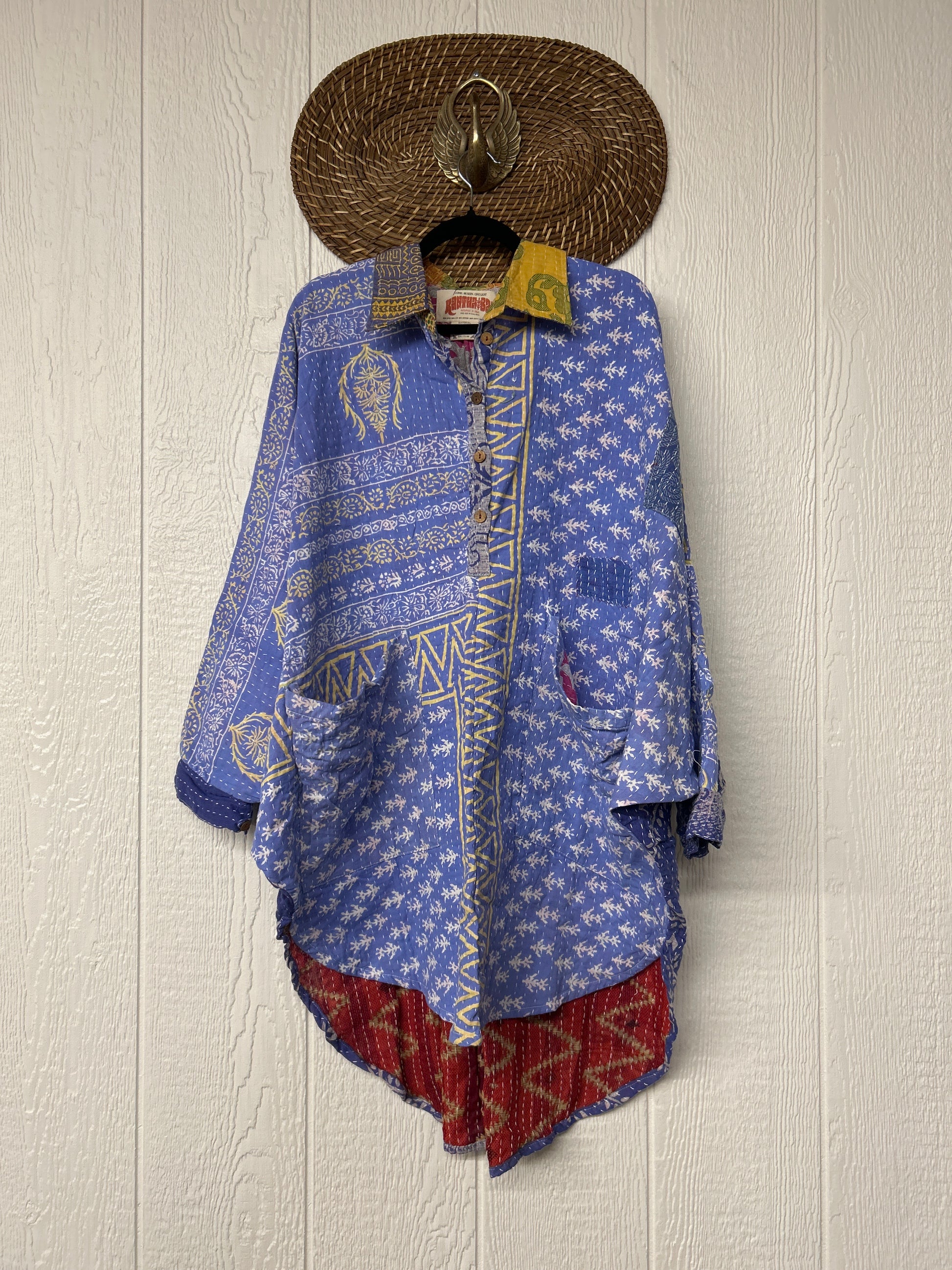 Made from our hand kantha stitched vintage cotton sari, this piece of wearable art features a henley neckline with functional buttons, slouchy outer pockets, billowy sleeves and a rounded hemline. The perfect top to compliment your favorite kantha pants or bell bottoms.