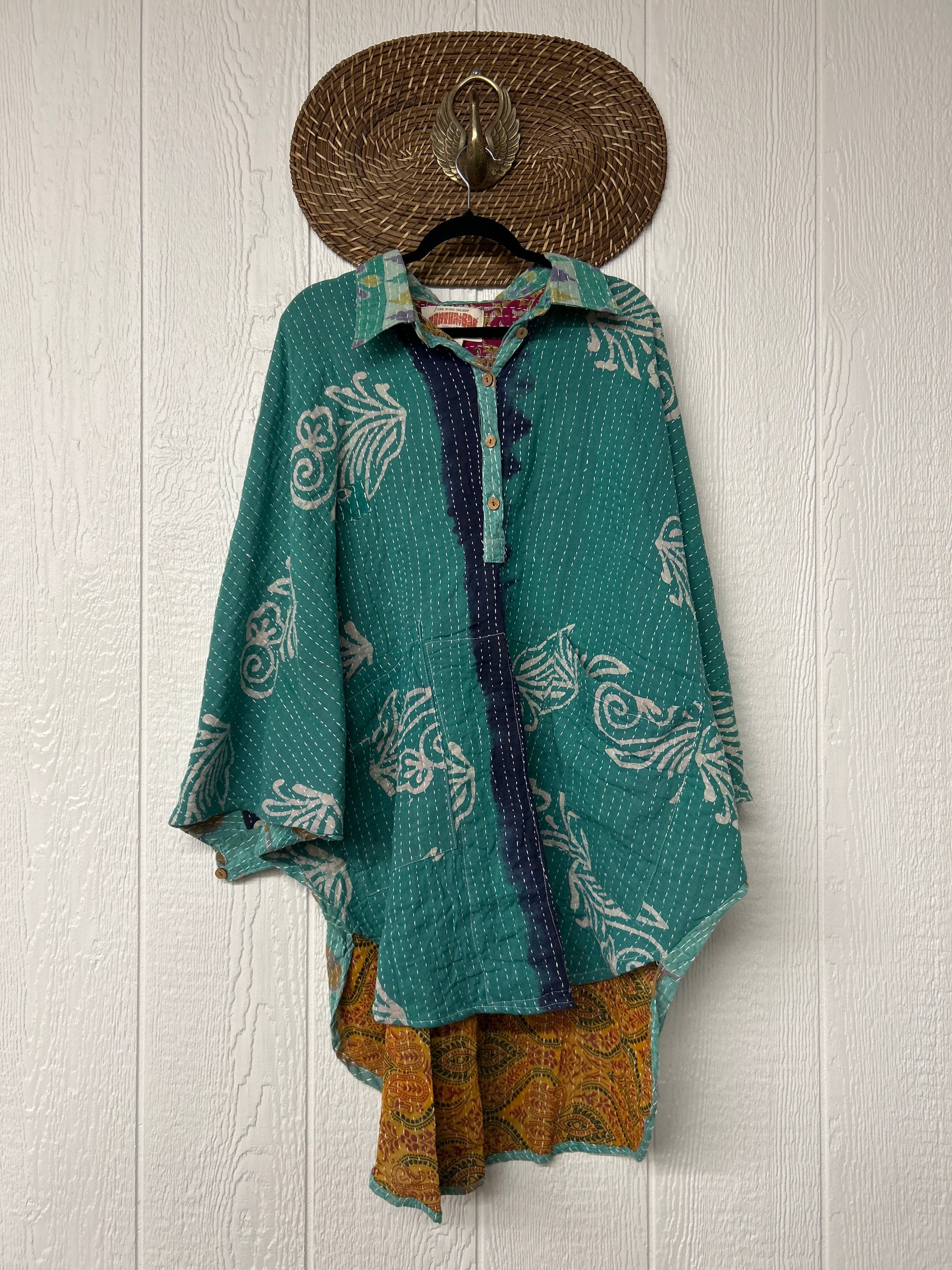 Made from our hand kantha stitched vintage cotton sari, this piece of wearable art features a henley neckline with functional buttons, slouchy outer pockets, billowy sleeves and a rounded hemline. The perfect top to compliment your favorite kantha pants or bell bottoms.