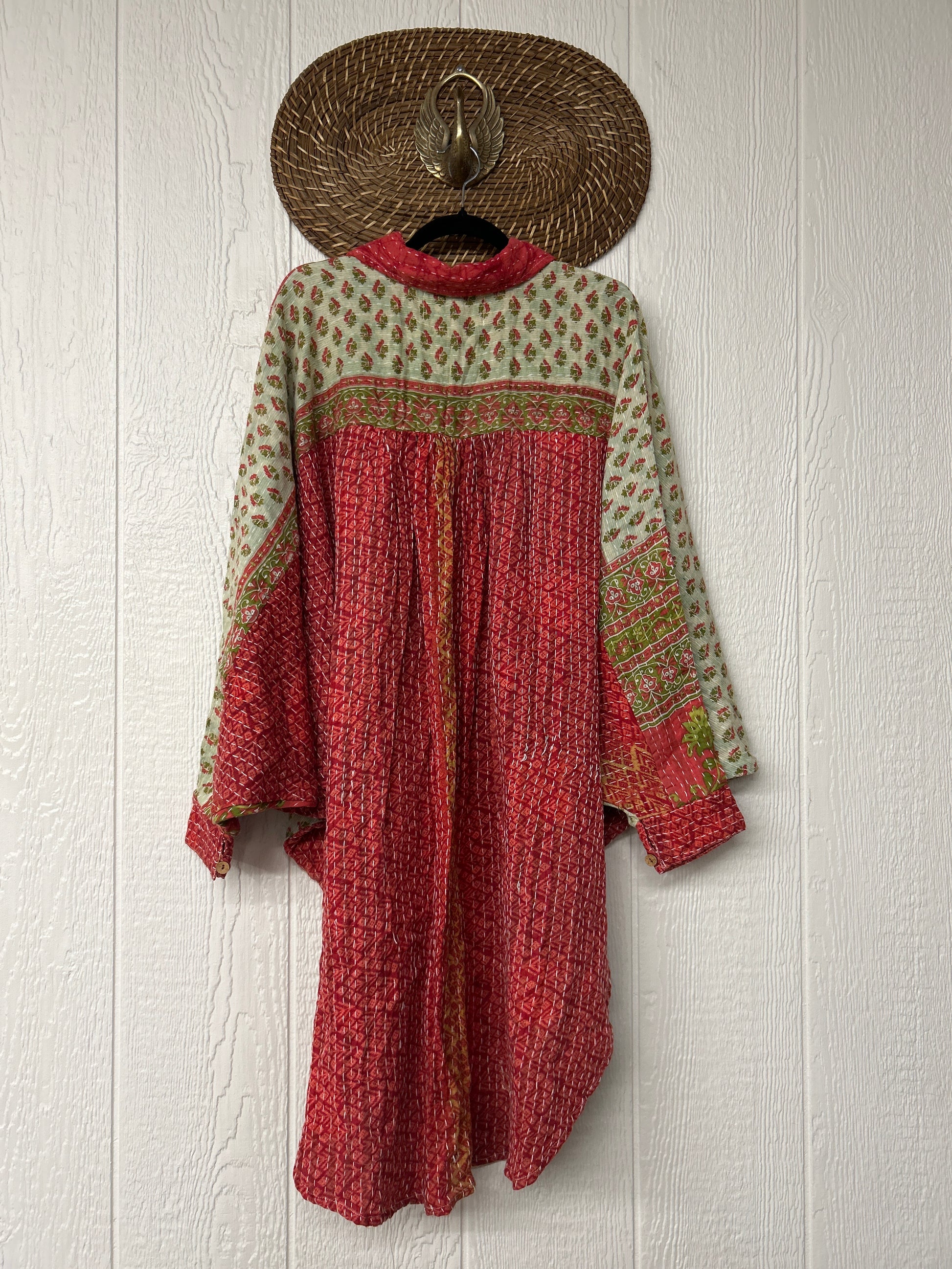 Made from our hand kantha stitched vintage cotton sari, this piece of wearable art features a henley neckline with functional buttons, slouchy outer pockets, billowy sleeves and a rounded hemline. The perfect top to compliment your favorite kantha pants or bell bottoms.