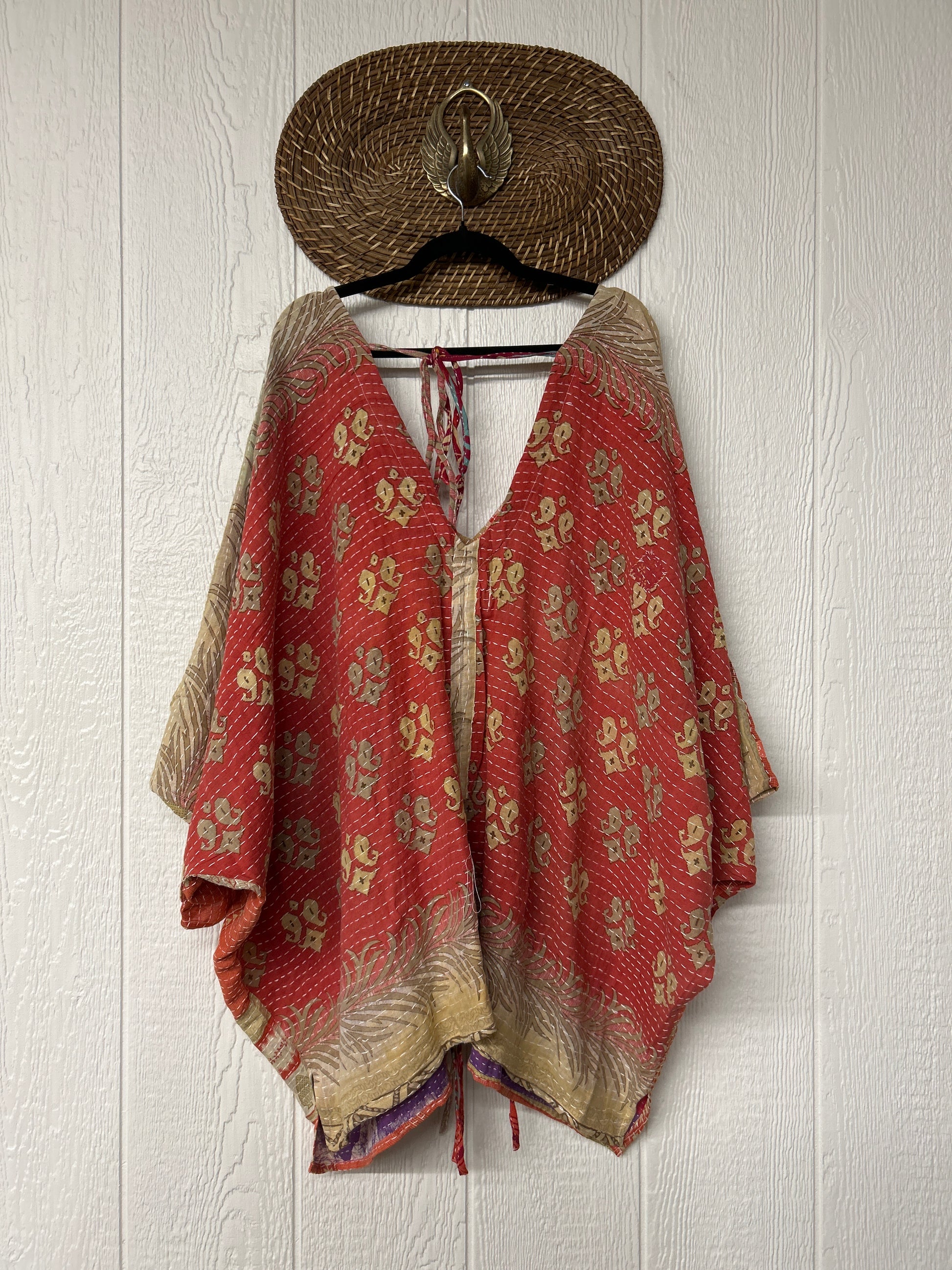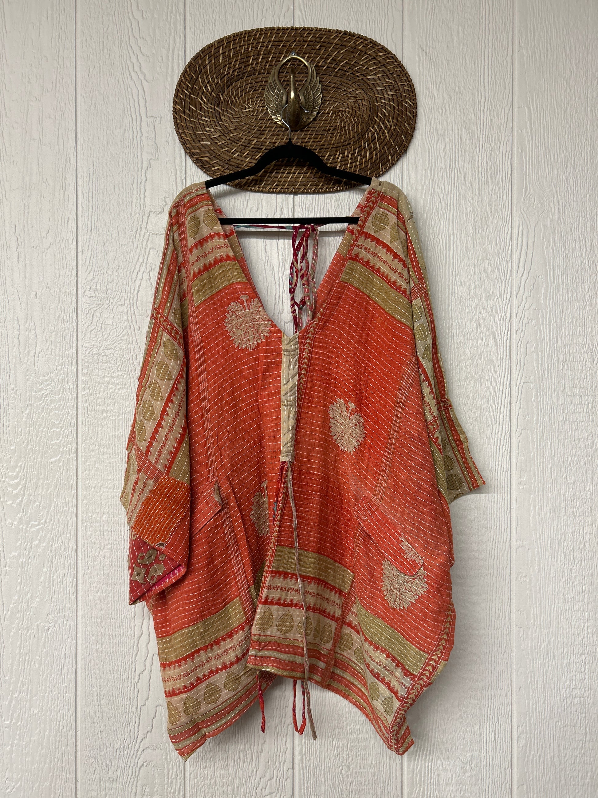 Fabrics may have small threads or holes in the layers. Color inconsistency or small stains may be present. The saris are sewn together and extend the life of each design. Imperfections should be celebrated.