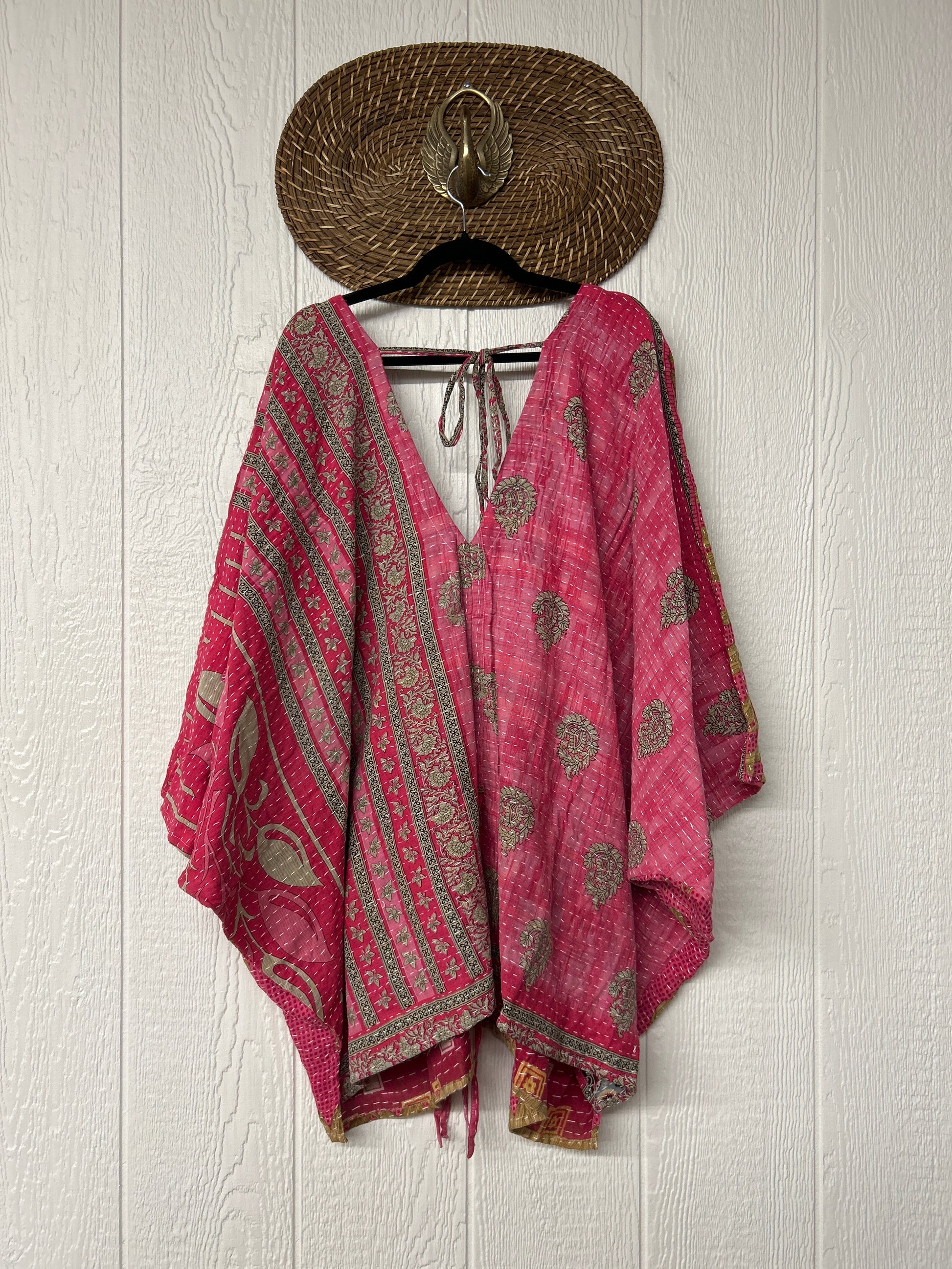 Fabrics may have small threads or holes in the layers. Color inconsistency or small stains may be present. The saris are sewn together and extend the life of each design. Imperfections should be celebrated.
