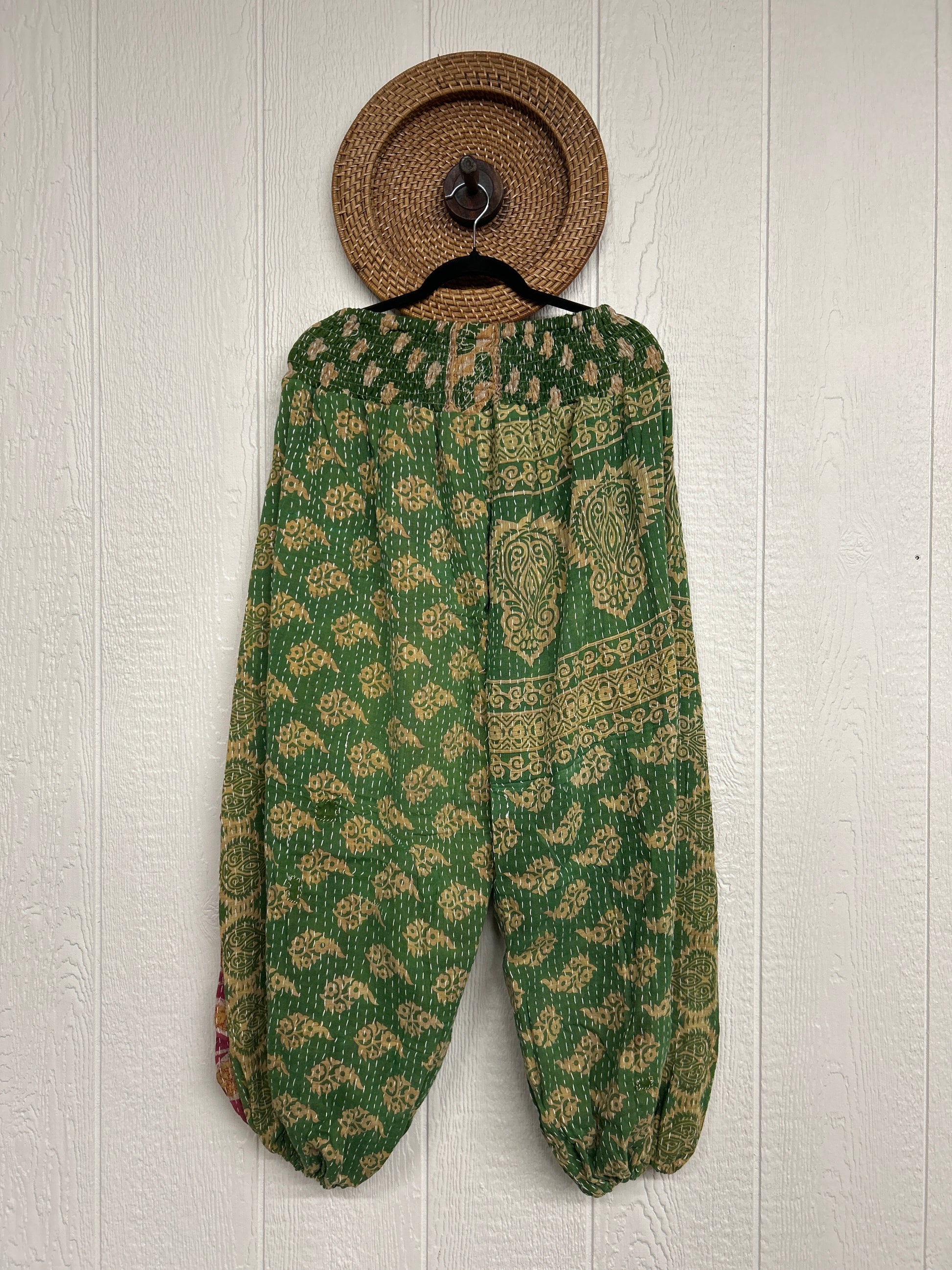Crafted from our ultra lux kantha stitched vintage cotton sari these pants feature exterior slouchy pockets, a stretchy waistband and an elastic ankle opening. Dress these dream pants up or down to become the ultimate vibe!
