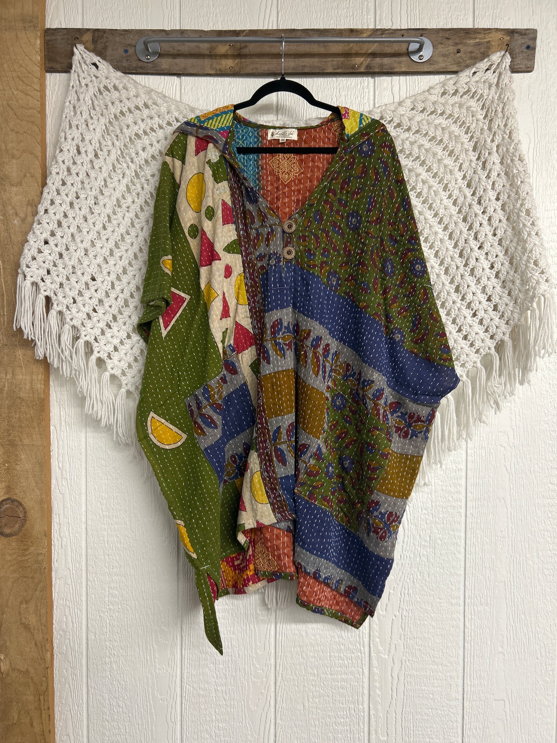 Crafted from our pareo kantha stitched cotton sari this dream peace features a hood, two buttons, two slouchy big pockets and side slits for extra dimension. A timeless transitional piece that will transform any outfit into a lux hippie moment!