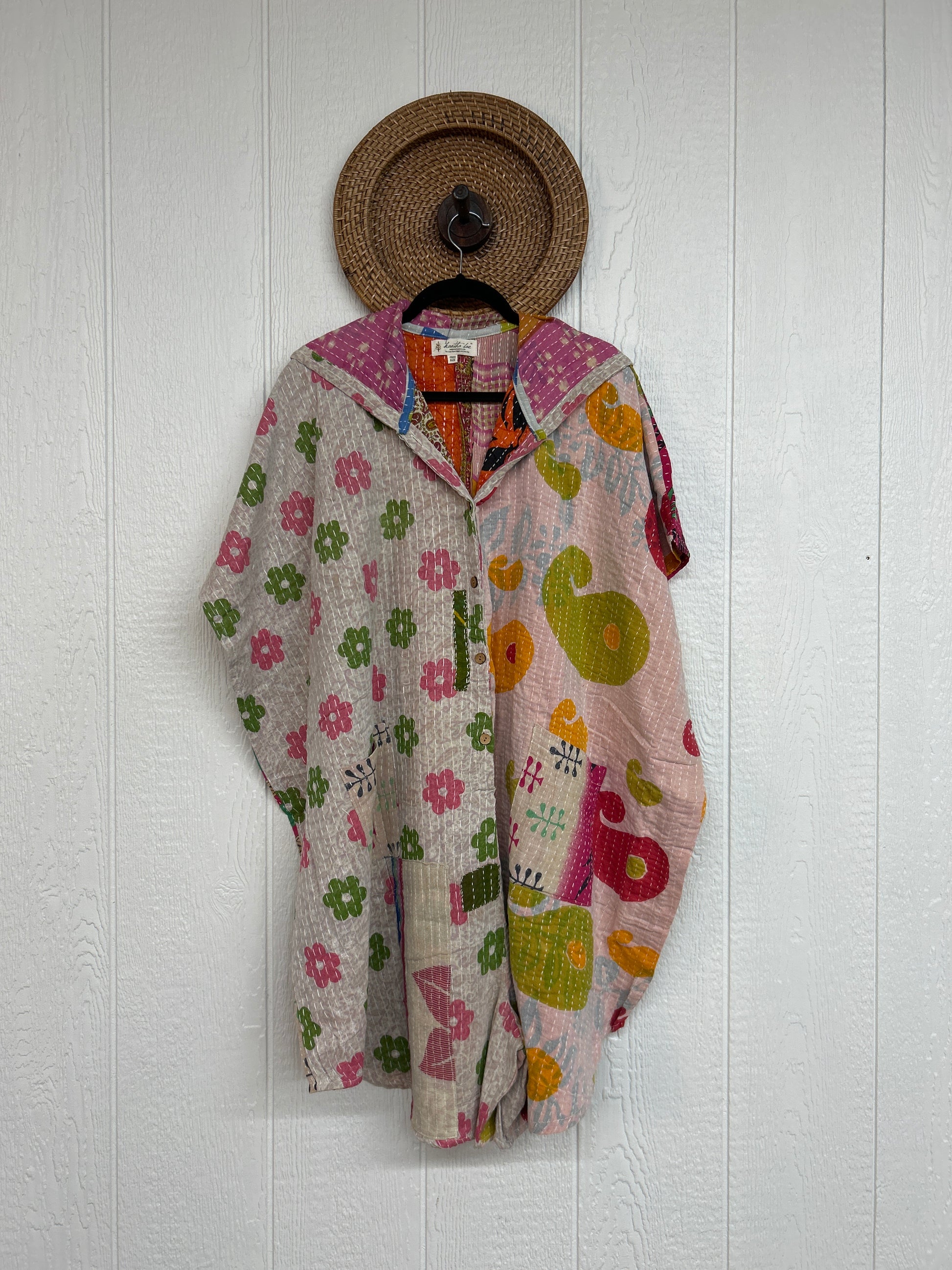 Made from our hand Kantha stitched cotton sari, this one piece wonder features a hood, front button-down closure, pockets, and super flowy shorts. Size Recommended 00-20/22. Crafted and sewn by families in a small village in Northern India, providing work and a fair living.