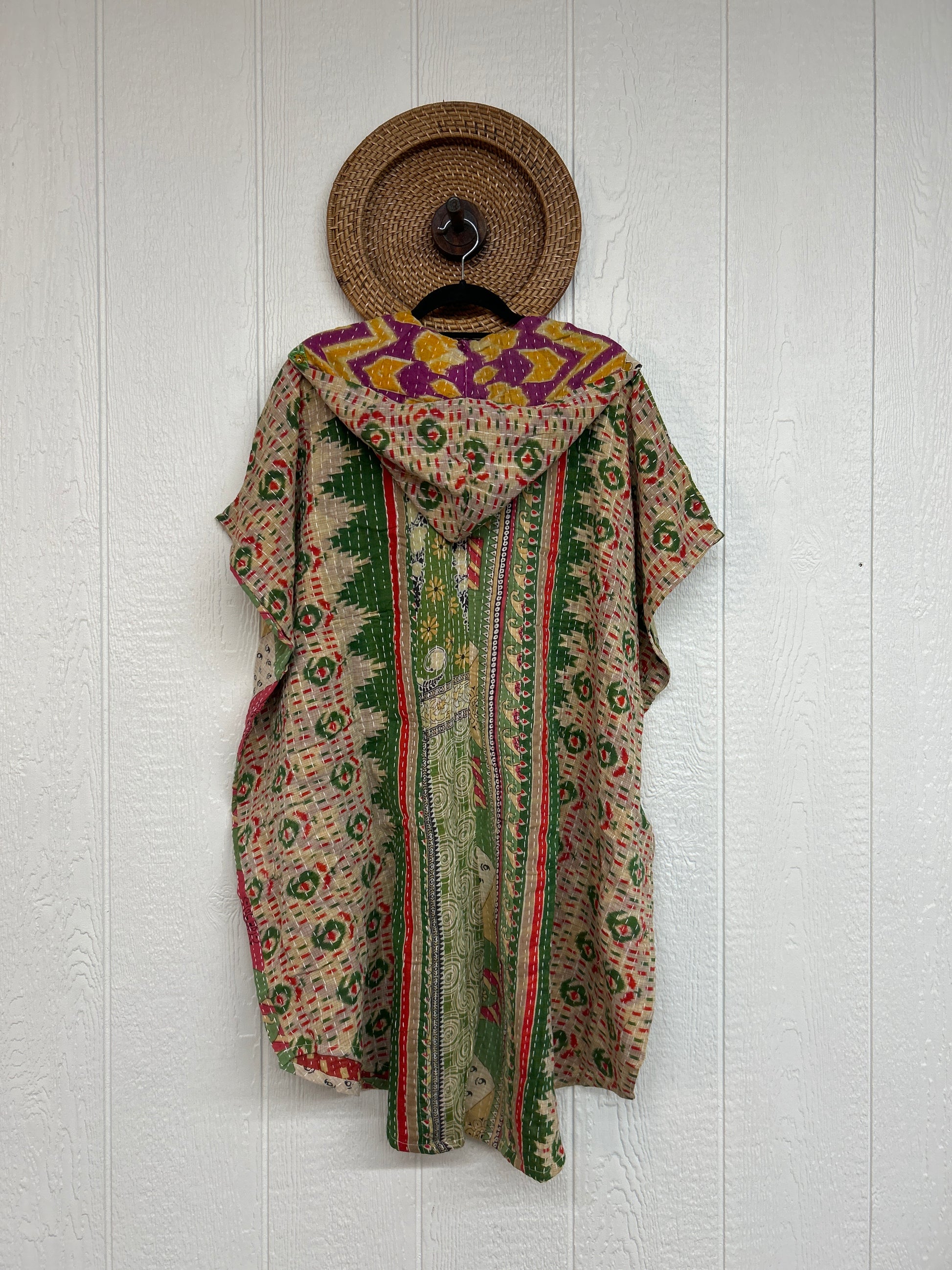 Made from our hand Kantha stitched cotton sari, this one piece wonder features a hood, front button-down closure, pockets, and super flowy shorts. Size Recommended 00-20/22. Crafted and sewn by families in a small village in Northern India, providing work and a fair living.