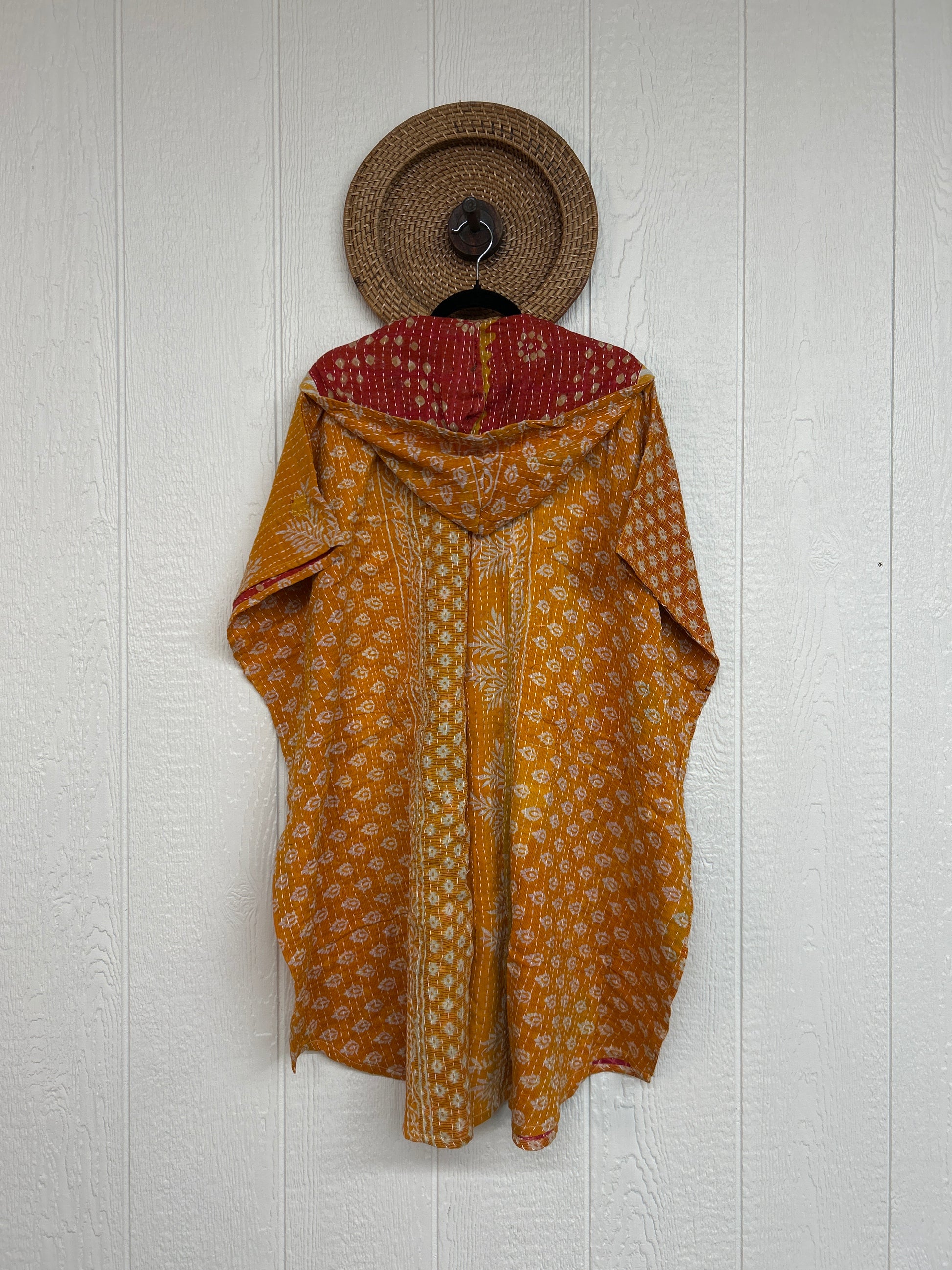 Made from our hand Kantha stitched cotton sari, this one piece wonder features a hood, front button-down closure, pockets, and super flowy shorts. Size Recommended 00-20/22. Crafted and sewn by families in a small village in Northern India, providing work and a fair living.