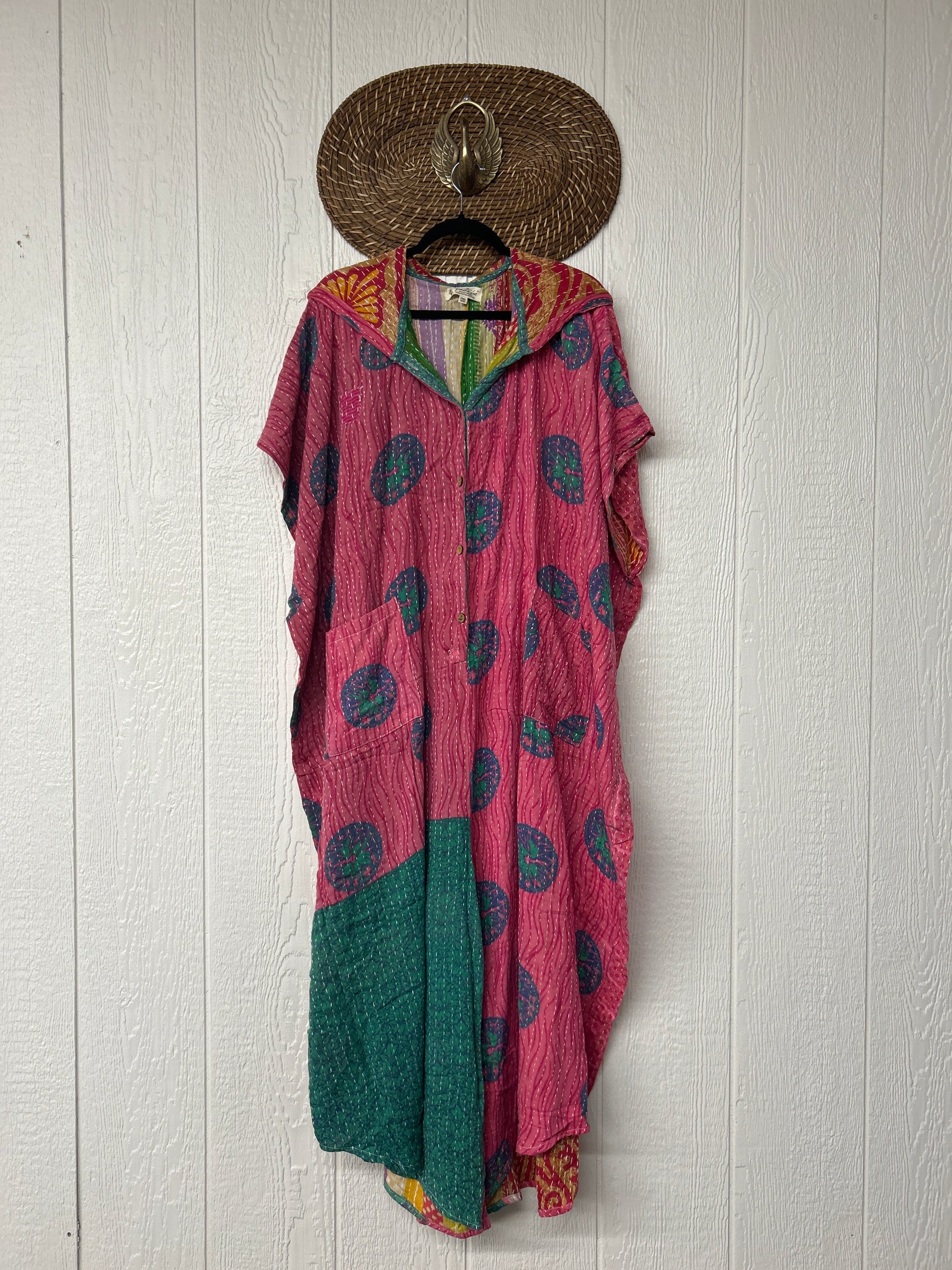 Made from our hand Kantha stitched cotton sari, this one piece wonder features a hood, front button-down closure, pockets, and super flowy pant legs..