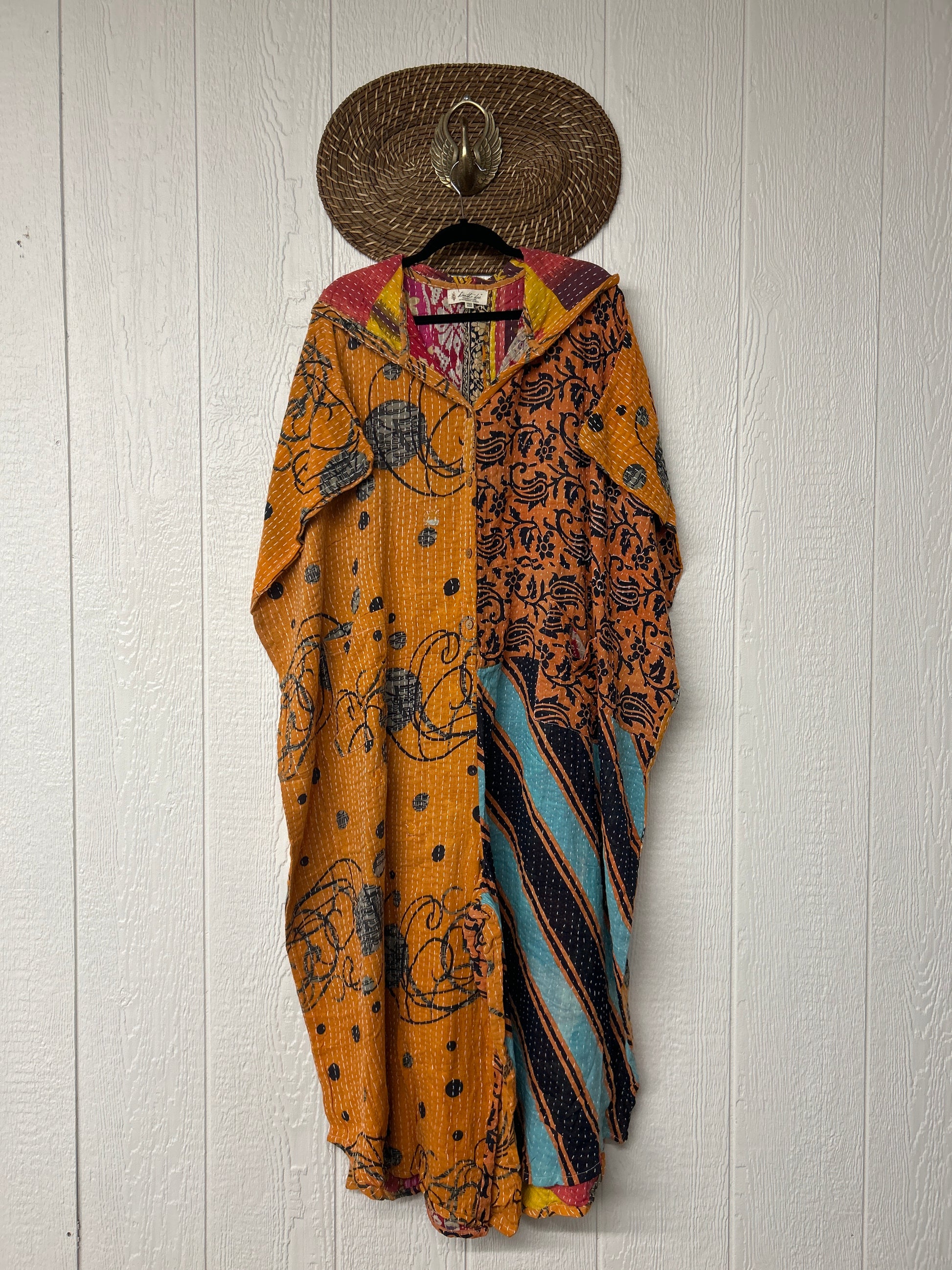 Made from our hand Kantha stitched cotton sari, this one piece wonder features a hood, front button-down closure, pockets, and super flowy pant legs..