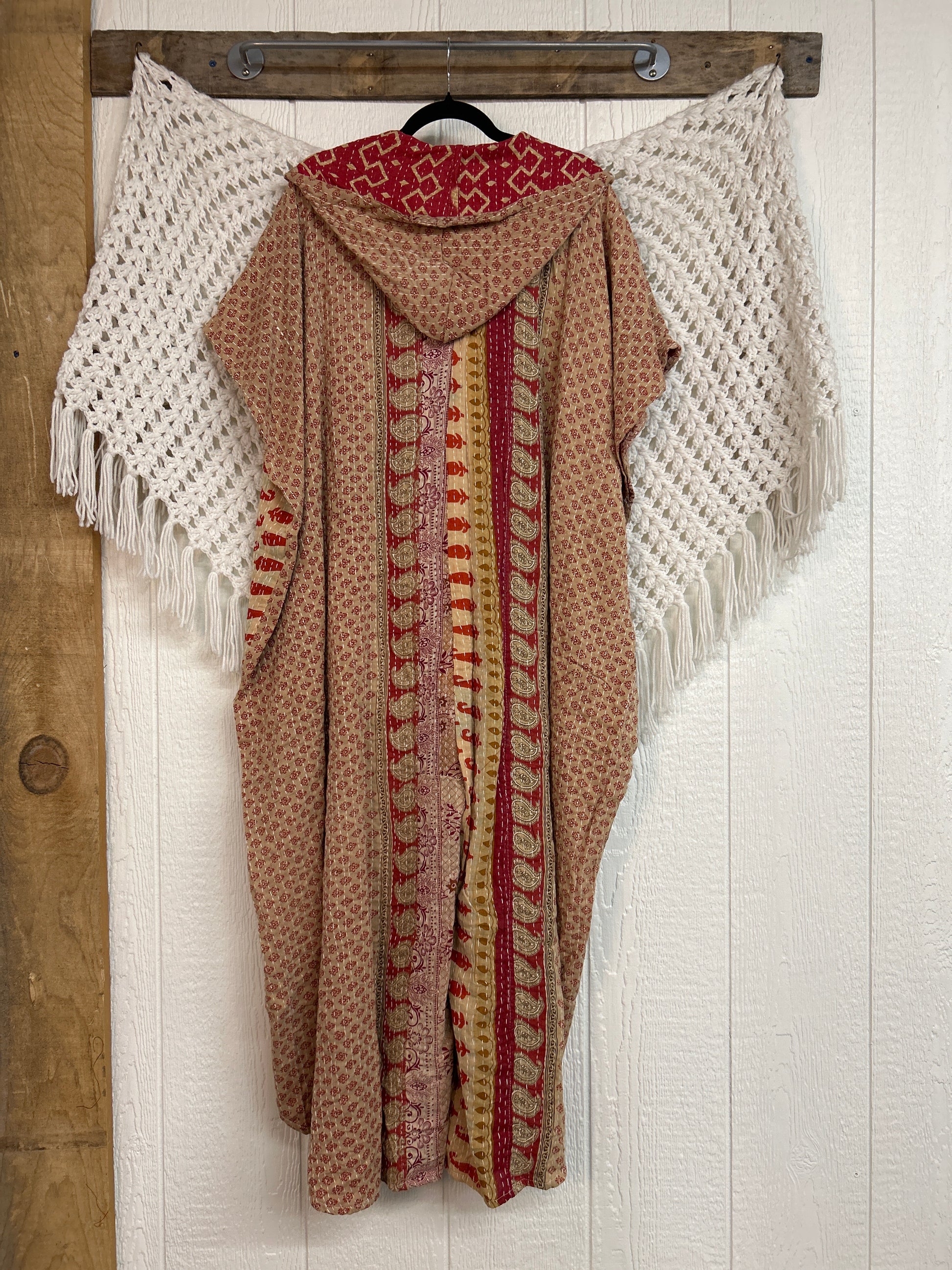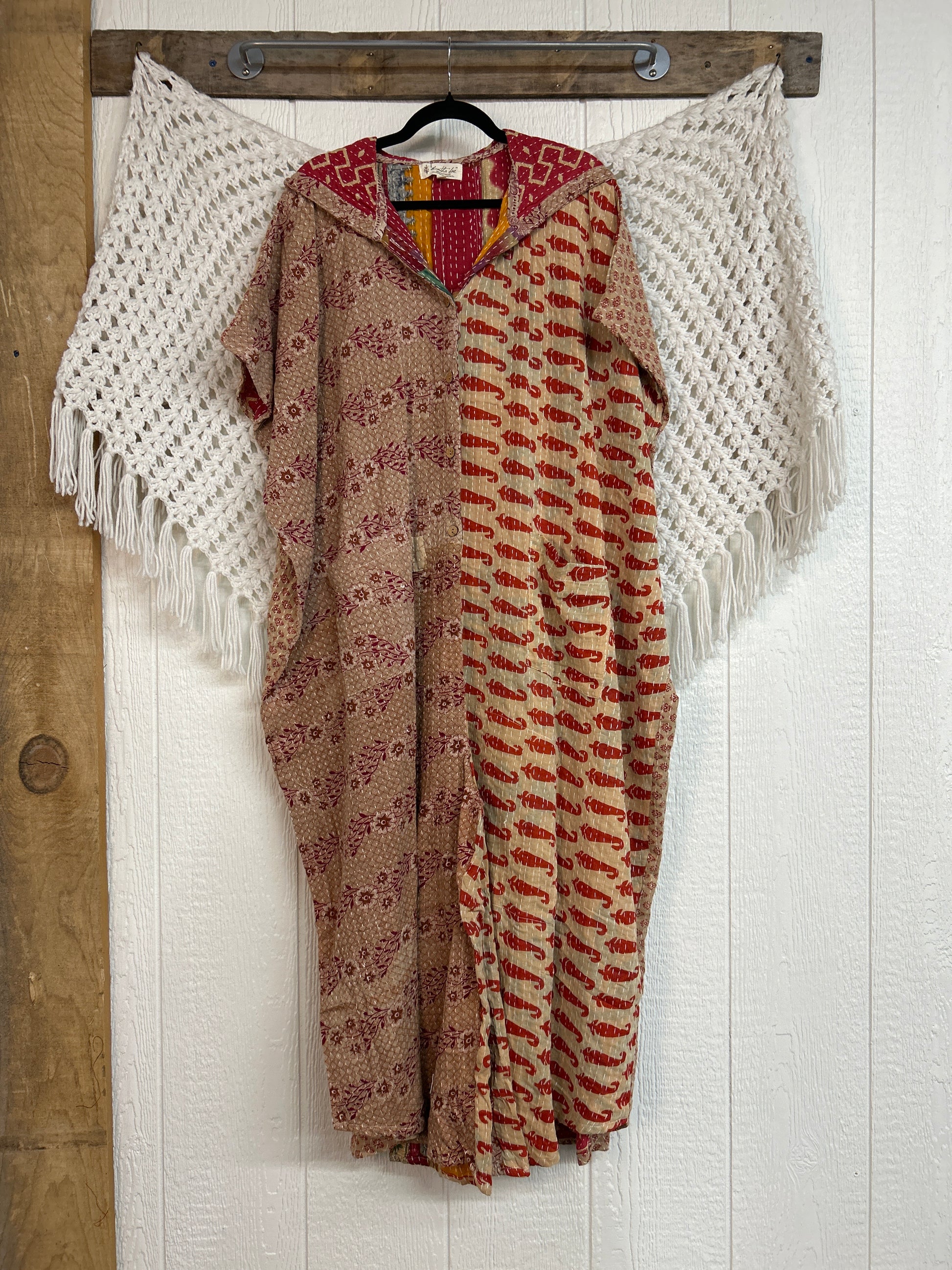 Made from our hand Kantha stitched cotton sari, this one piece wonder features a hood, front button-down closure, pockets, and super flowy pant legs..