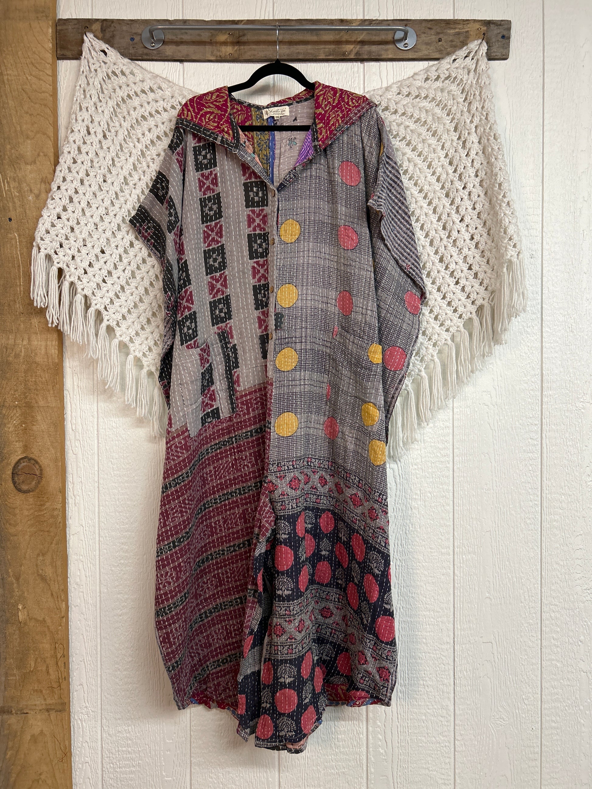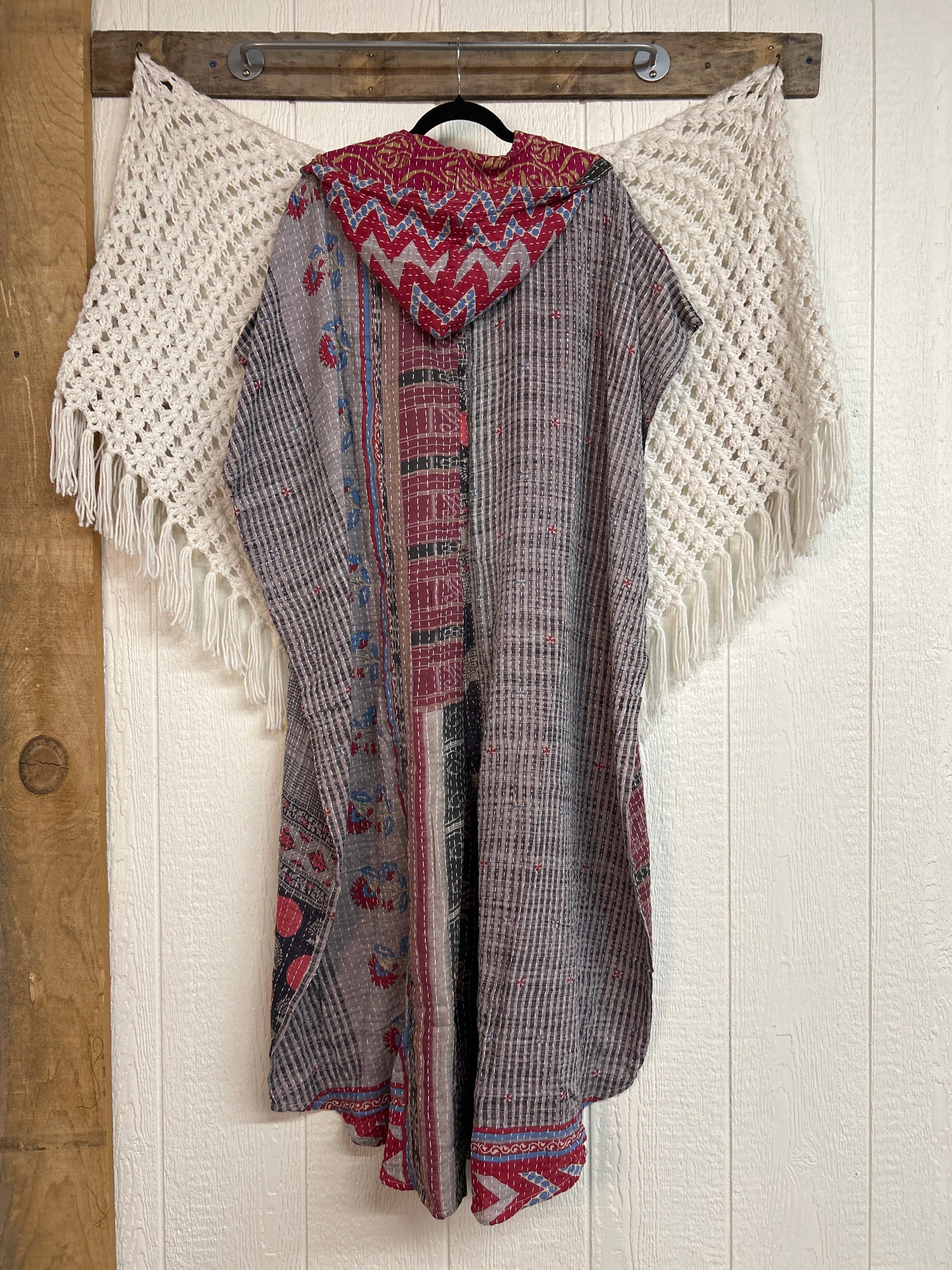 Made from our hand Kantha stitched cotton sari, this one piece wonder features a hood, front button-down closure, pockets, and super flowy pant legs..