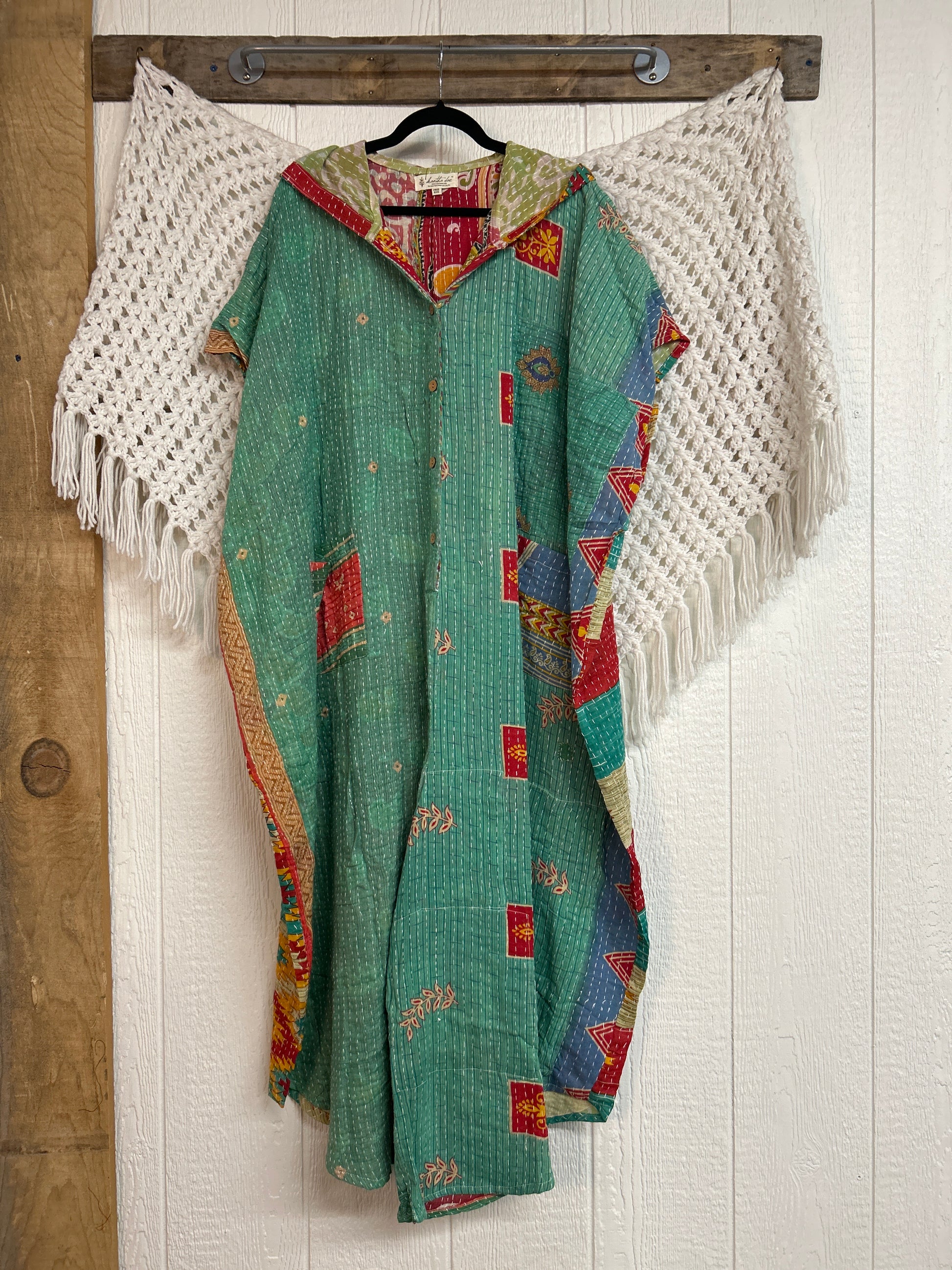 Made from our hand Kantha stitched cotton sari, this one piece wonder features a hood, front button-down closure, pockets, and super flowy pant legs..
