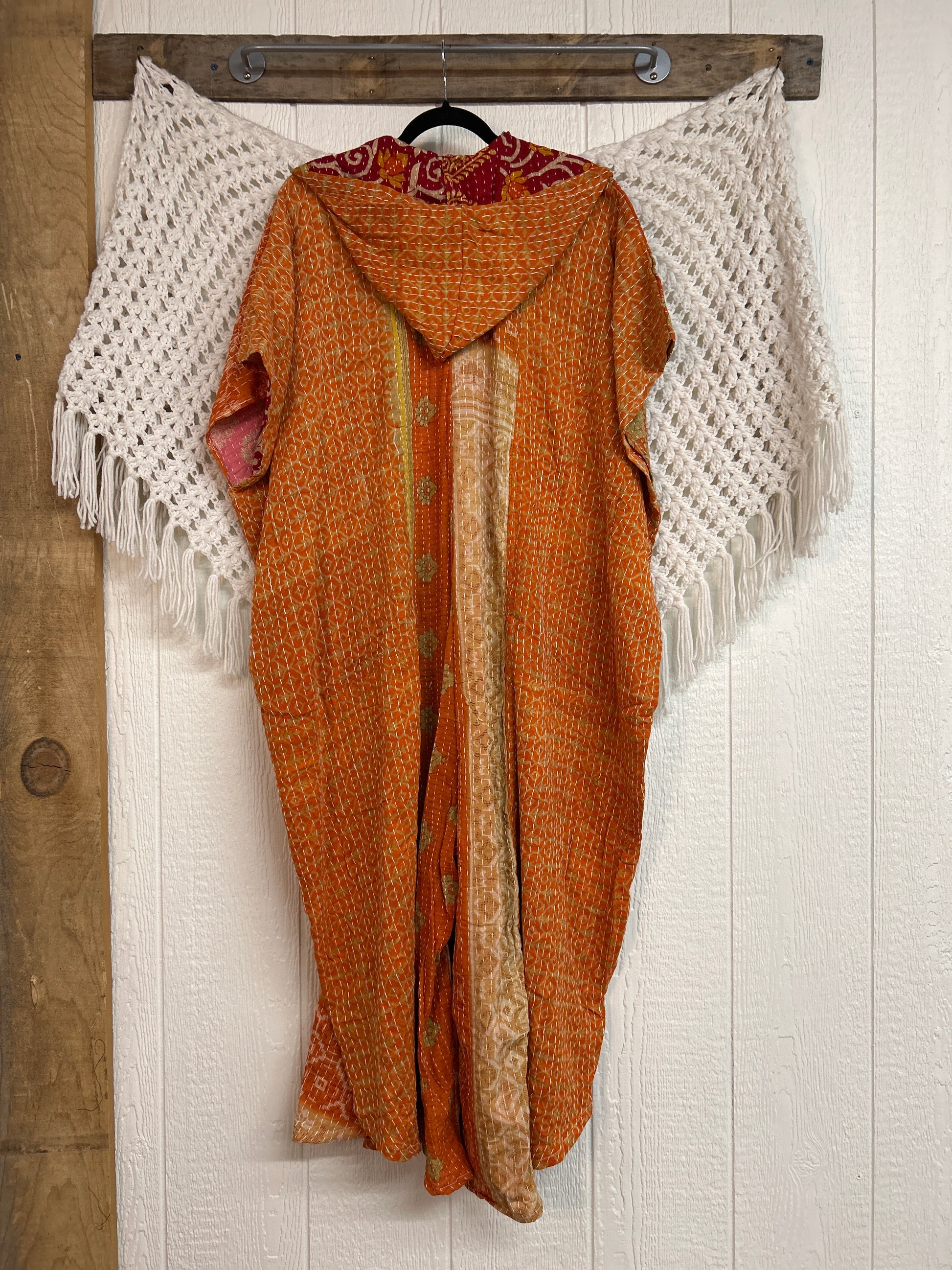 Made from our hand Kantha stitched cotton sari, this one piece wonder features a hood, front button-down closure, pockets, and super flowy pant legs..