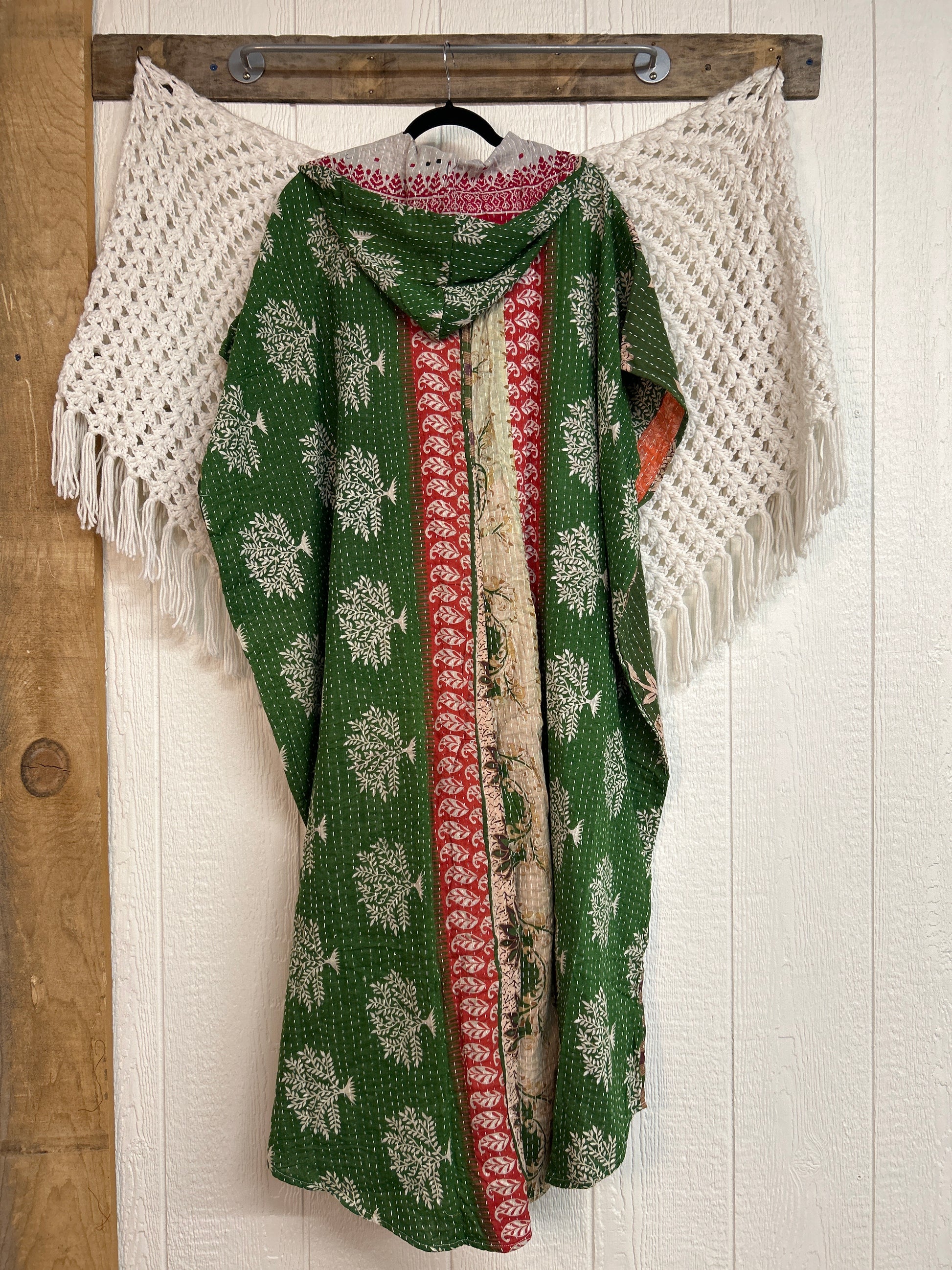 Made from our hand Kantha stitched cotton sari, this one piece wonder features a hood, front button-down closure, pockets, and super flowy pant legs..