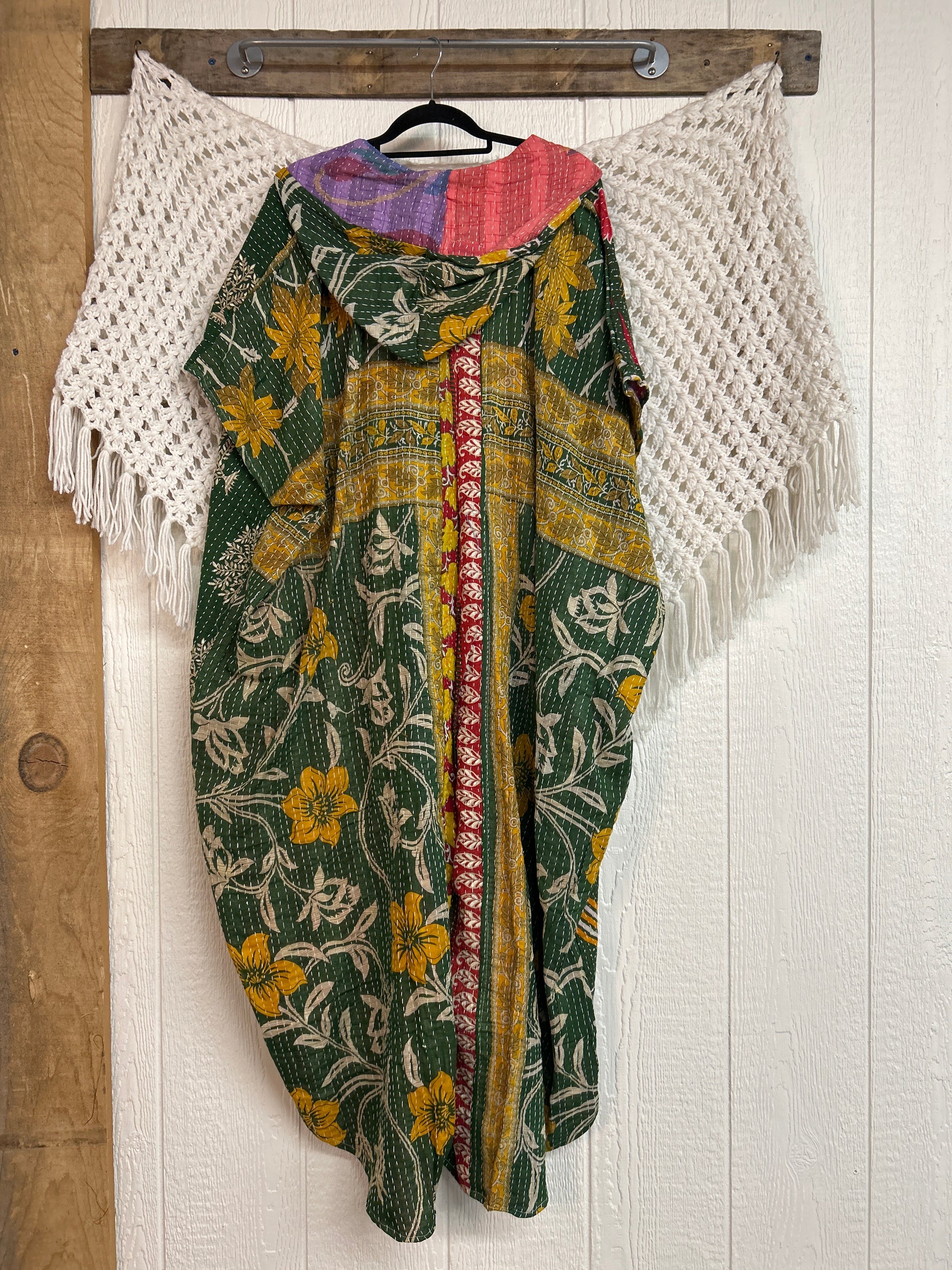 Made from our hand Kantha stitched cotton sari, this one piece wonder features a hood, front button-down closure, pockets, and super flowy pant legs..