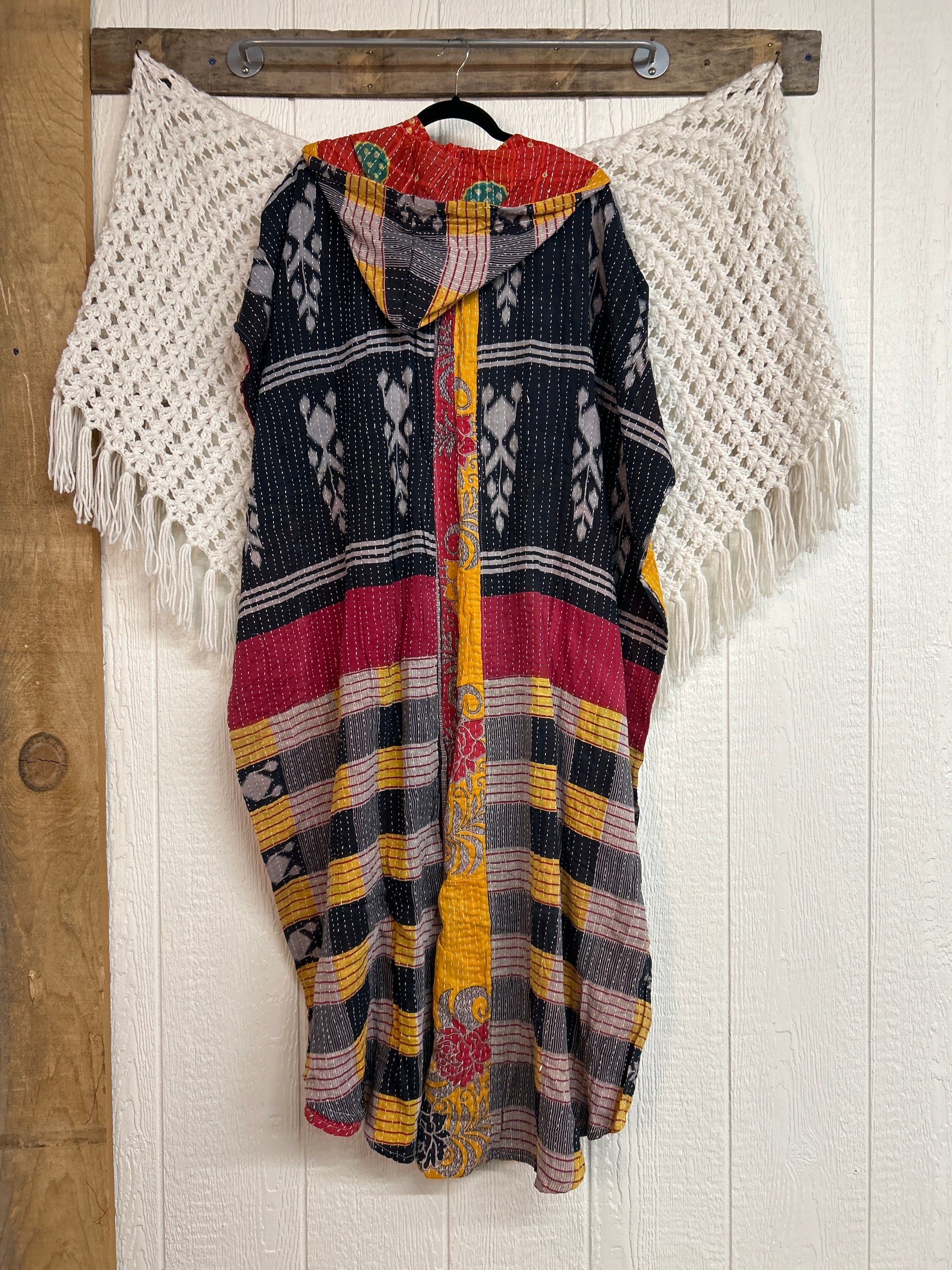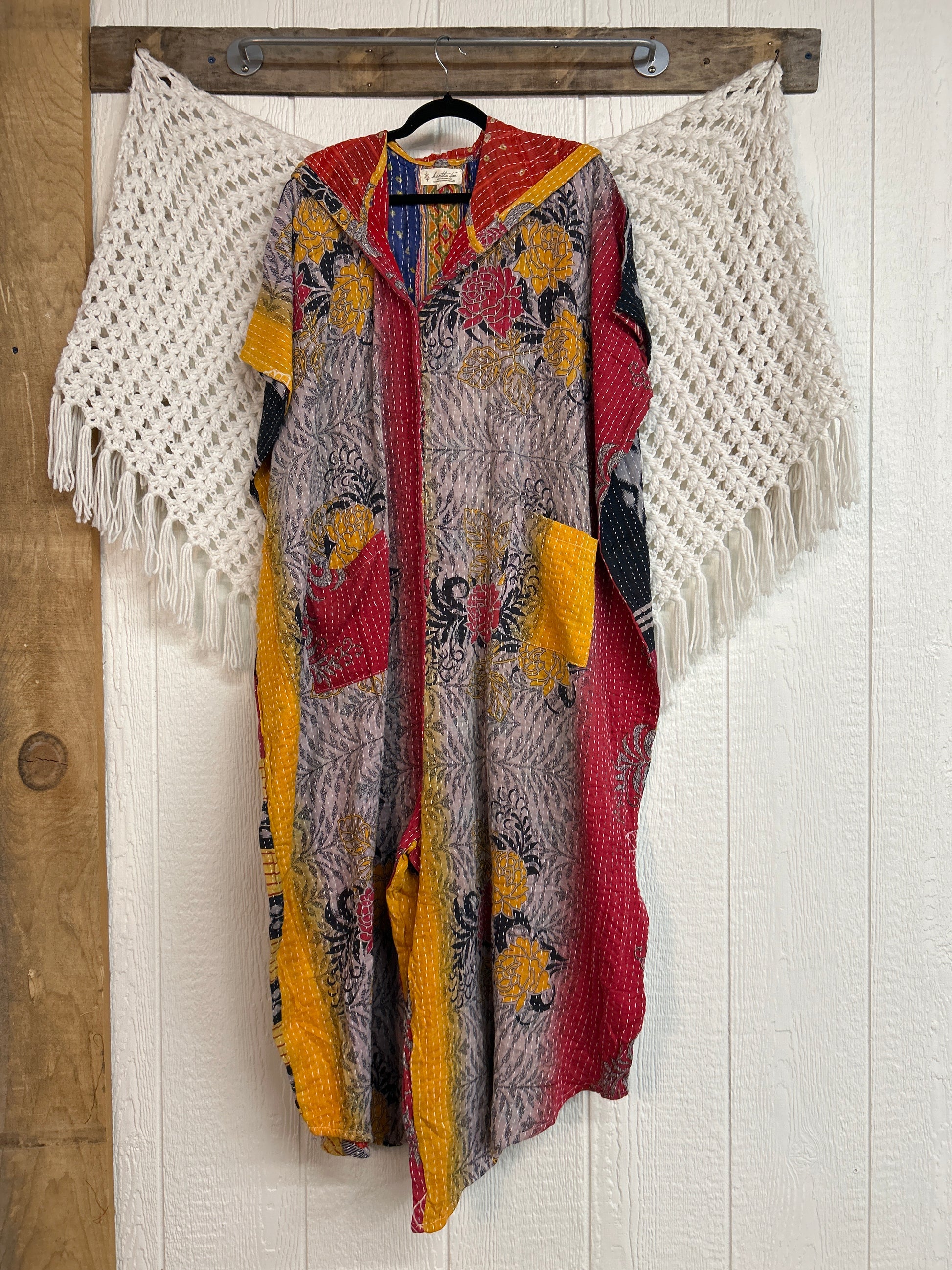 Made from our hand Kantha stitched cotton sari, this one piece wonder features a hood, front button-down closure, pockets, and super flowy pant legs..