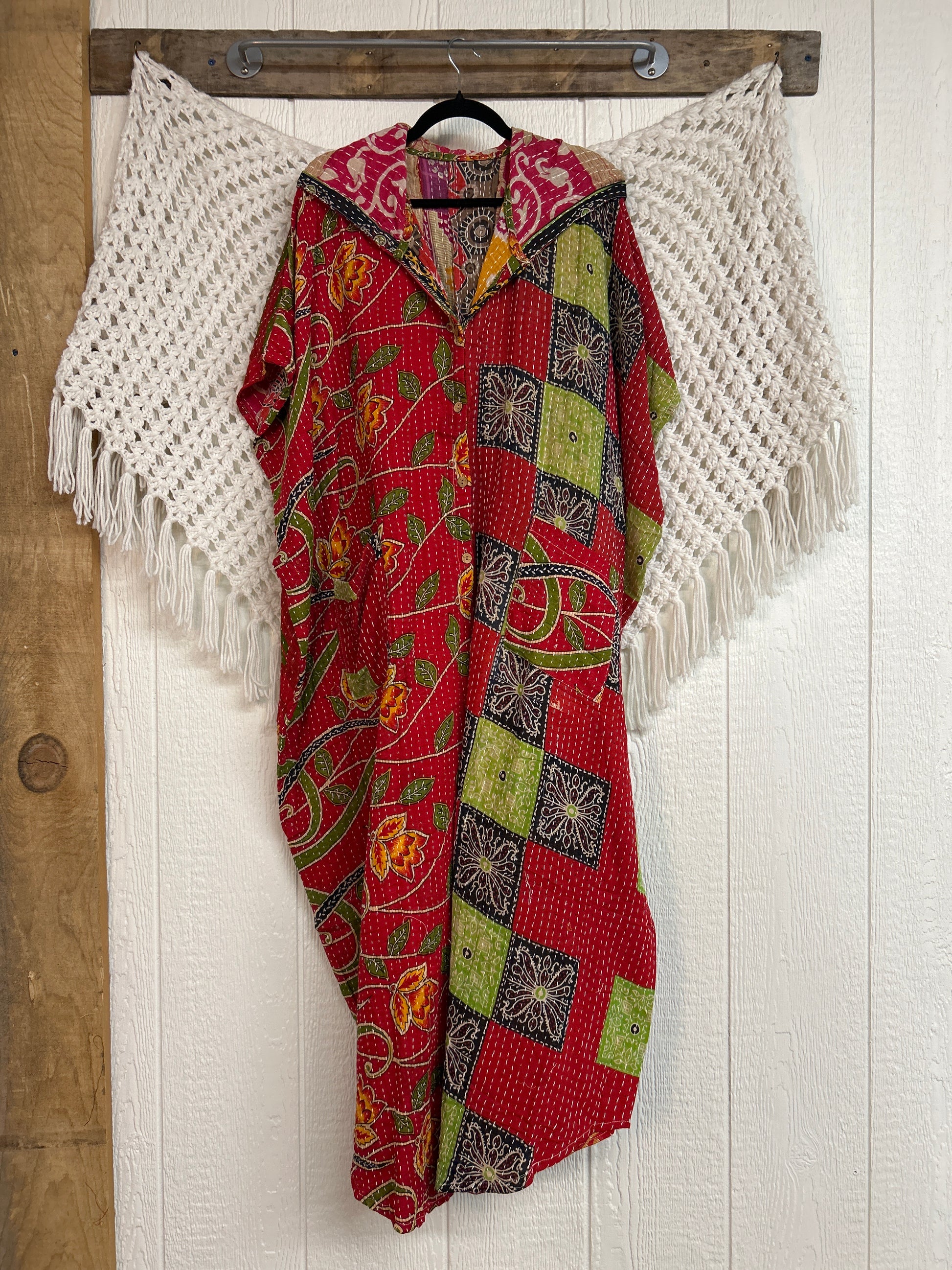 Made from our hand Kantha stitched cotton sari, this one piece wonder features a hood, front button-down closure, pockets, and super flowy pant legs..