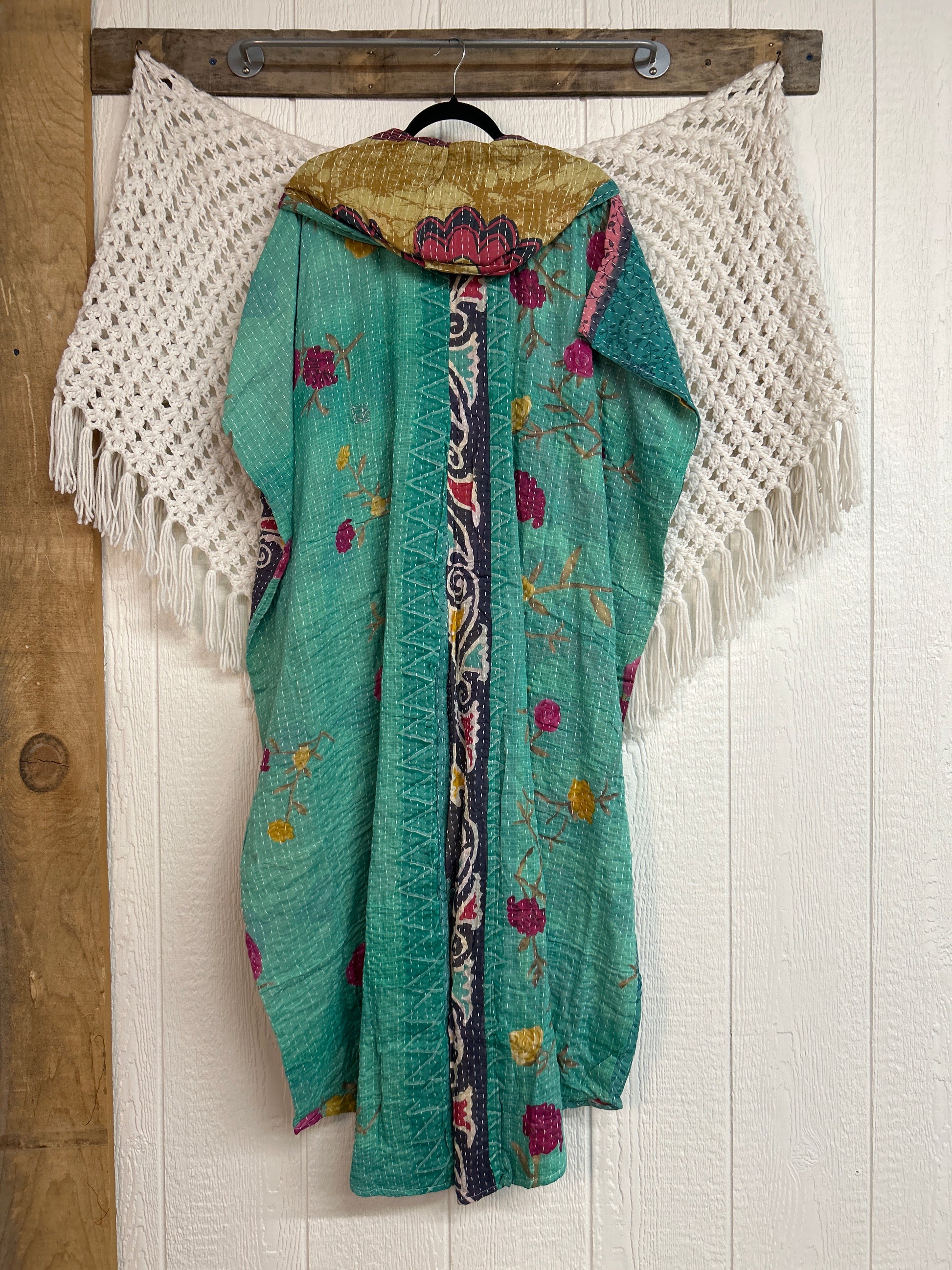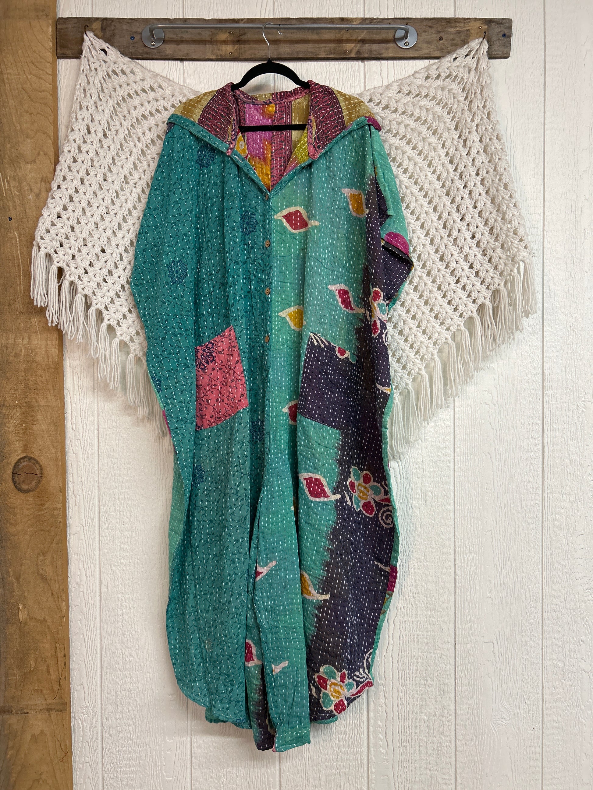 Made from our hand Kantha stitched cotton sari, this one piece wonder features a hood, front button-down closure, pockets, and super flowy pant legs..