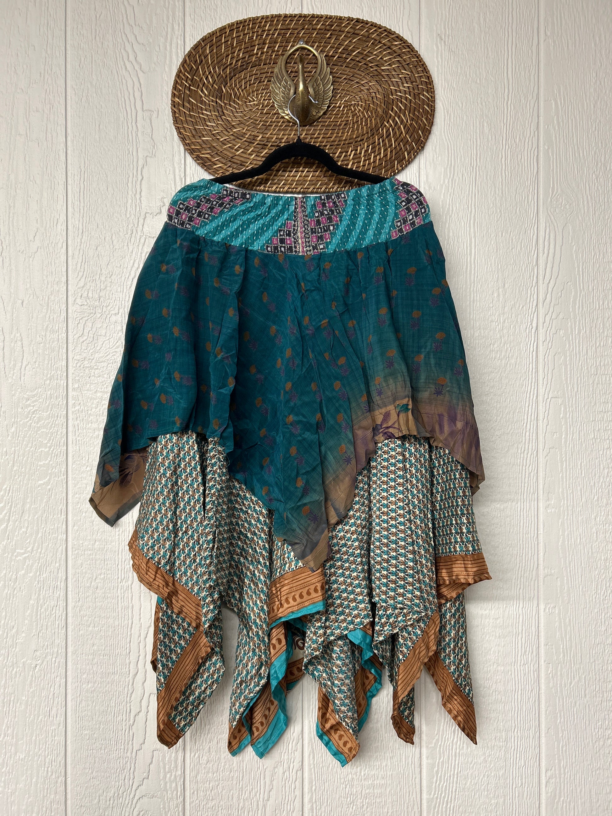crafted from our ultra lux vintage crepe and ragulla sari. Features a rock star asymmetrical hem and stretchy pareo kantha waistband. This versatile piece can be pulled up to be worn as a tunic!