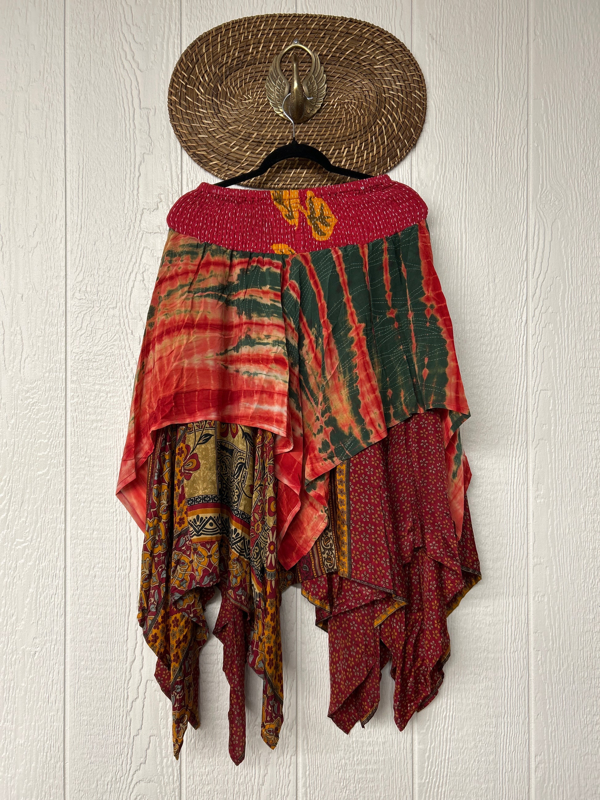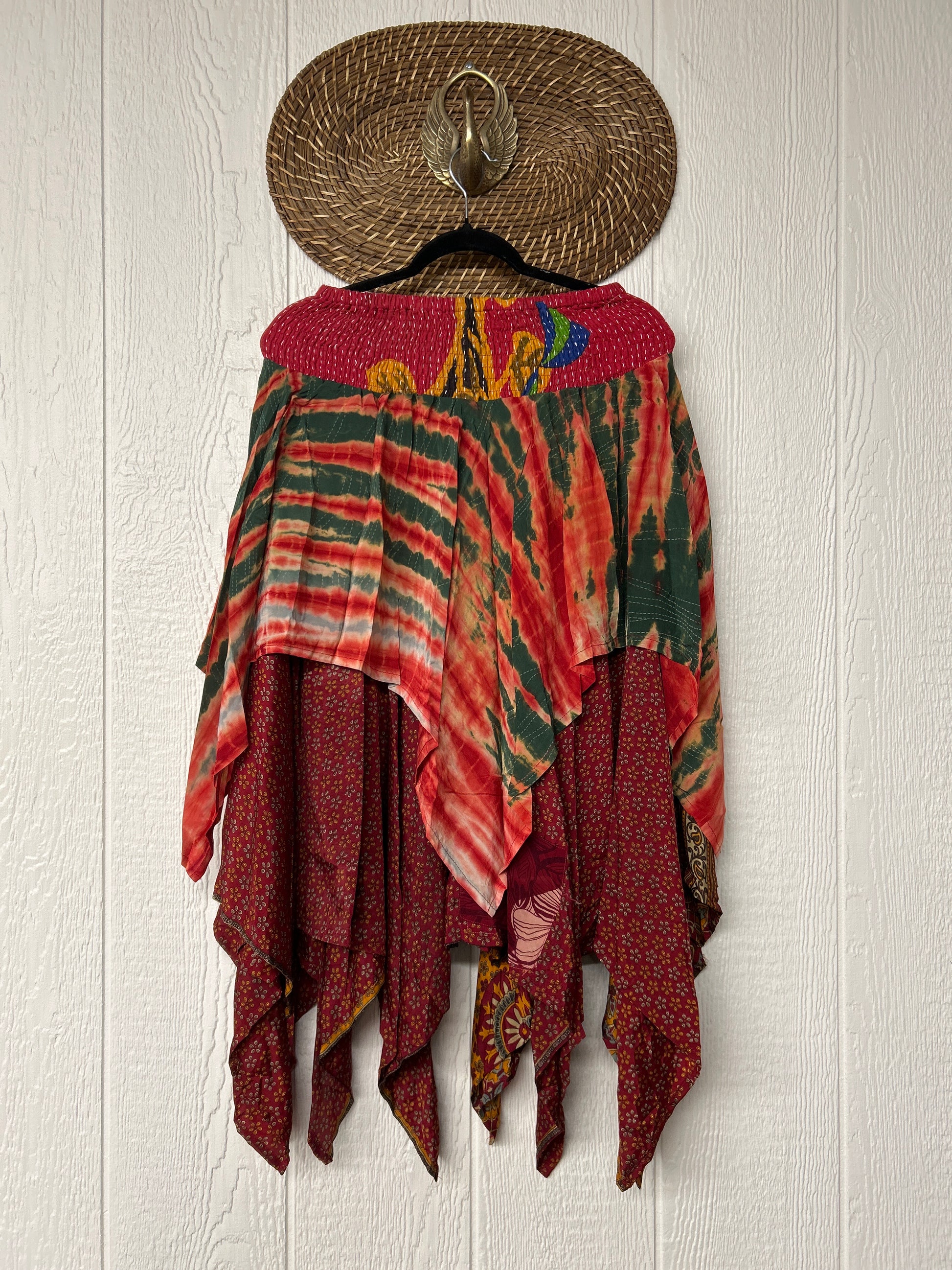 crafted from our ultra lux vintage crepe and ragulla sari. Features a rock star asymmetrical hem and stretchy pareo kantha waistband. This versatile piece can be pulled up to be worn as a tunic!