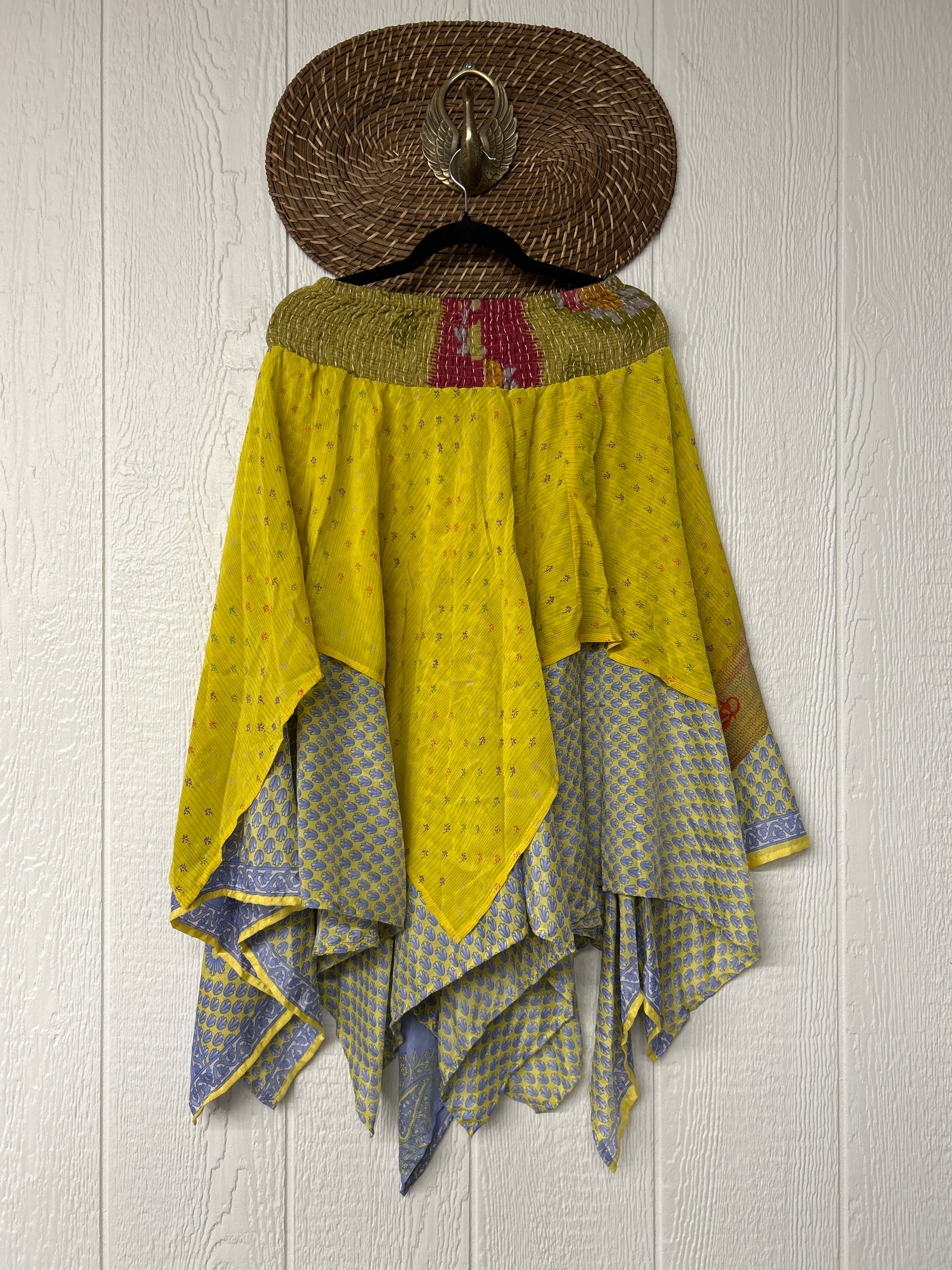 crafted from our ultra lux vintage crepe and ragulla sari. Features a rock star asymmetrical hem and stretchy pareo kantha waistband. This versatile piece can be pulled up to be worn as a tunic!