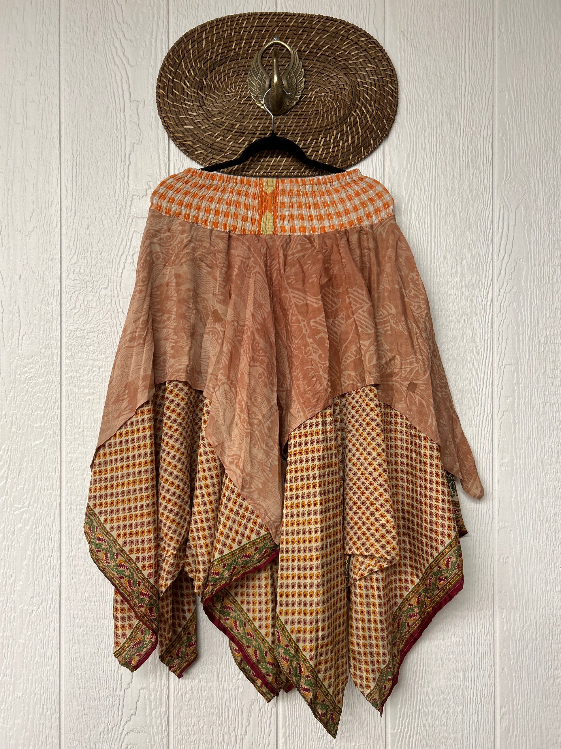 crafted from our ultra lux vintage crepe and ragulla sari. Features a rock star asymmetrical hem and stretchy pareo kantha waistband. This versatile piece can be pulled up to be worn as a tunic!