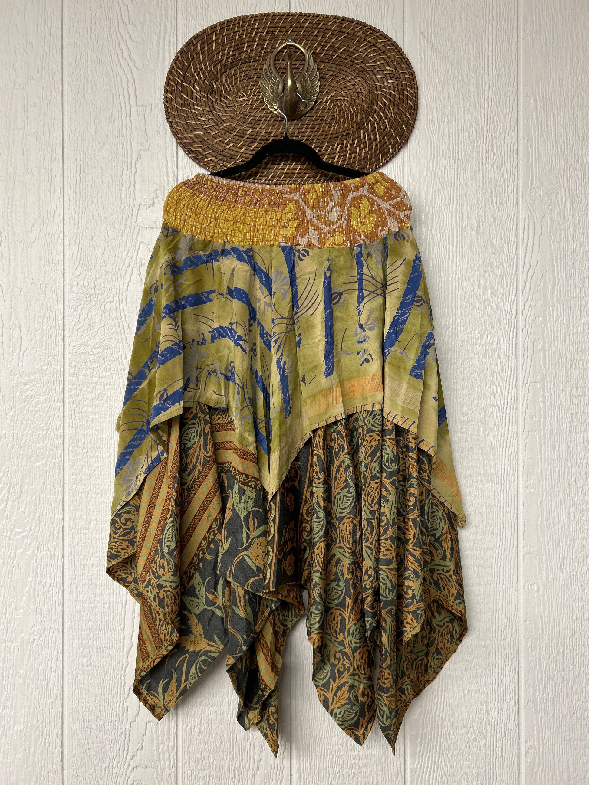 crafted from our ultra lux vintage crepe and ragulla sari. Features a rock star asymmetrical hem and stretchy pareo kantha waistband. This versatile piece can be pulled up to be worn as a tunic!