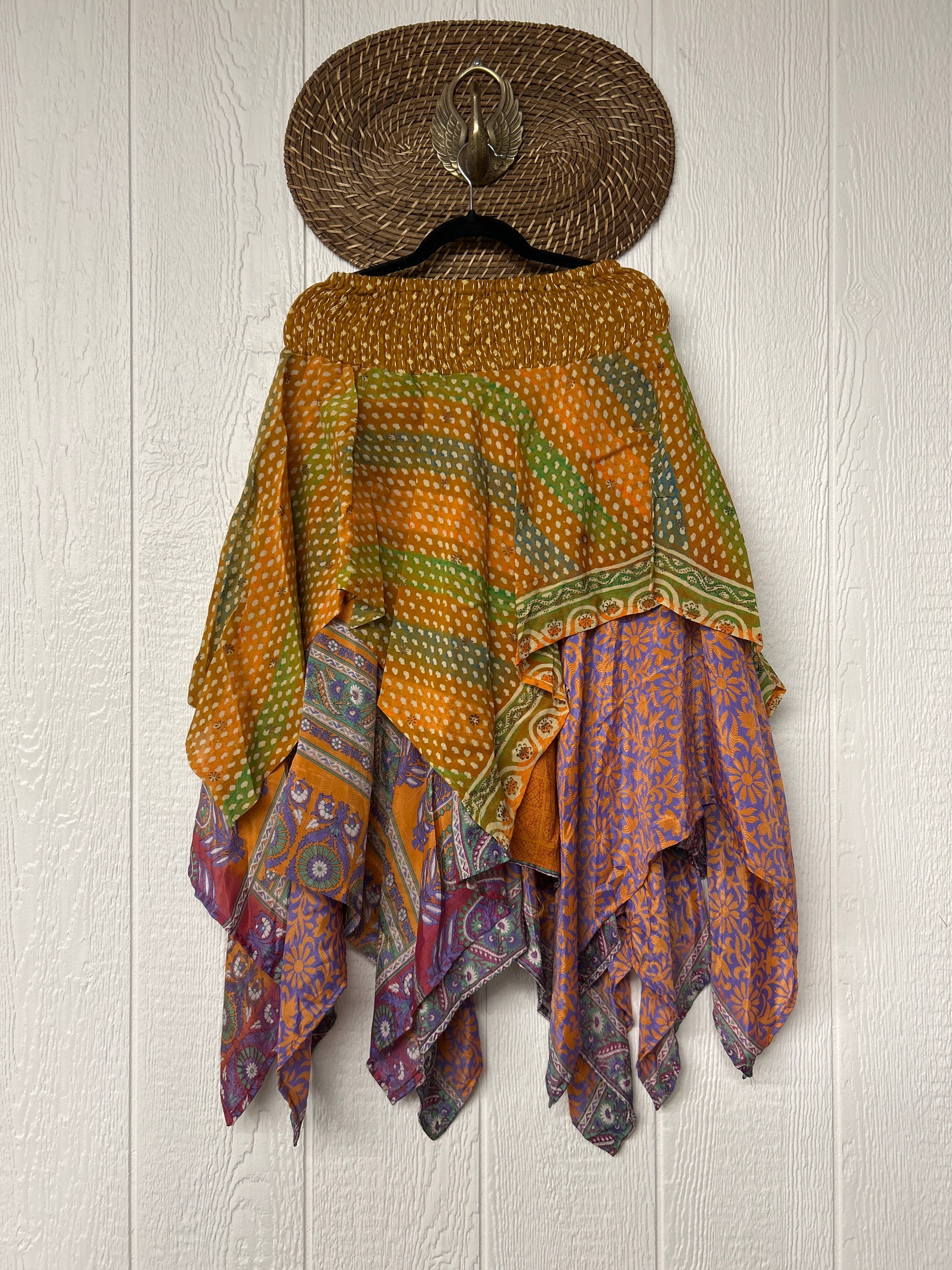 crafted from our ultra lux vintage crepe and ragulla sari. Features a rock star asymmetrical hem and stretchy pareo kantha waistband. This versatile piece can be pulled up to be worn as a tunic!