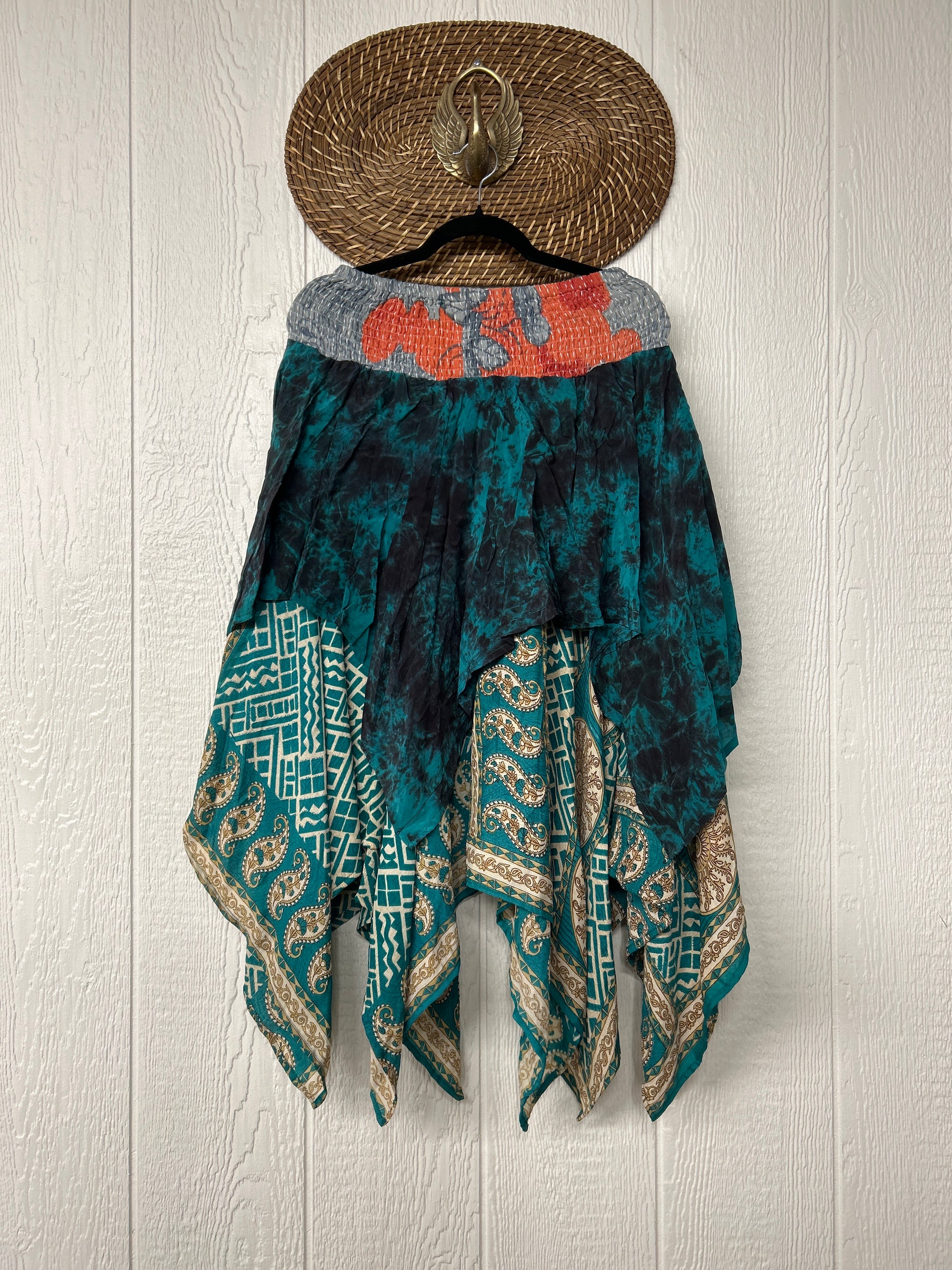 crafted from our ultra lux vintage crepe and ragulla sari. Features a rock star asymmetrical hem and stretchy pareo kantha waistband. This versatile piece can be pulled up to be worn as a tunic!