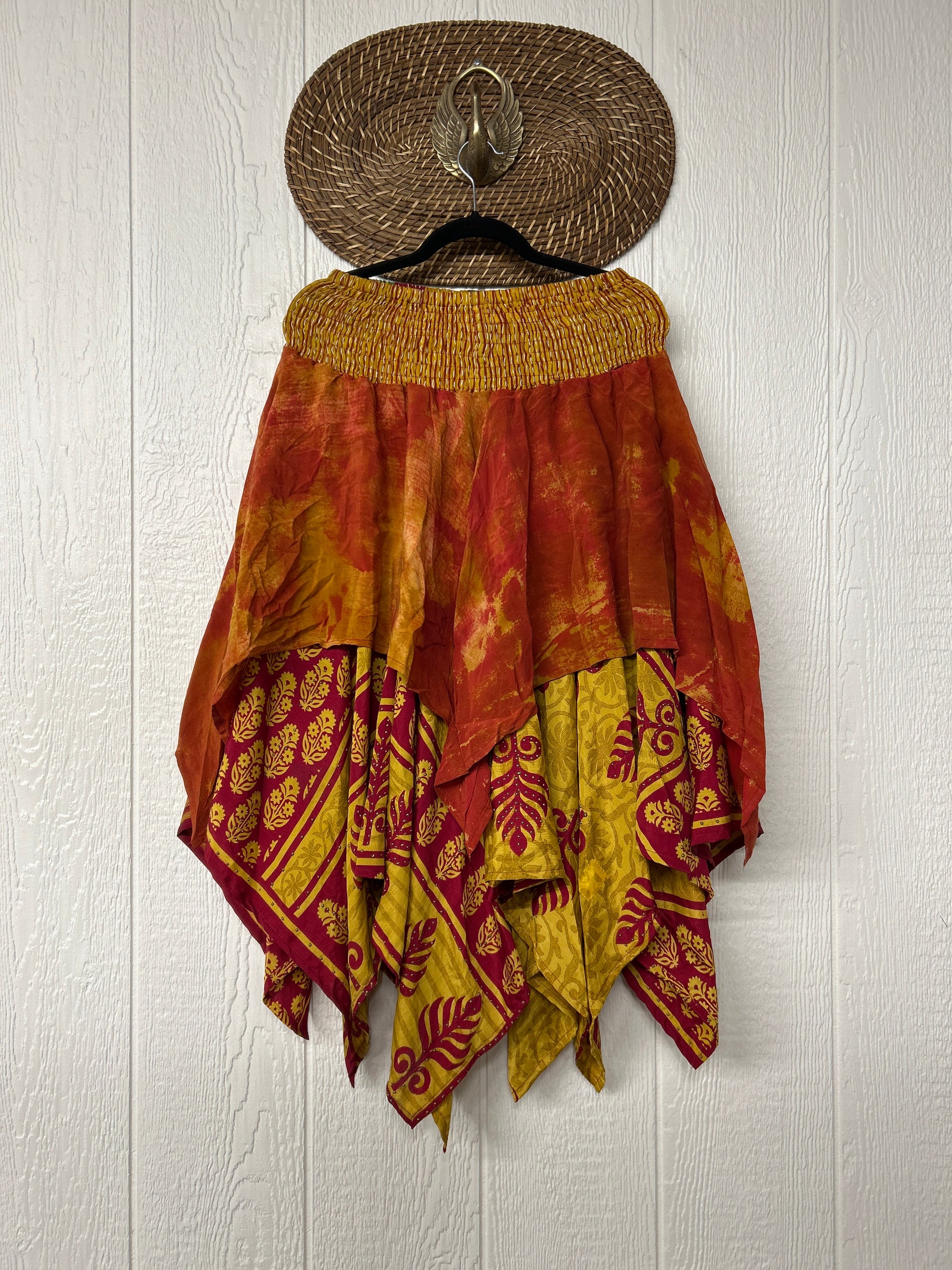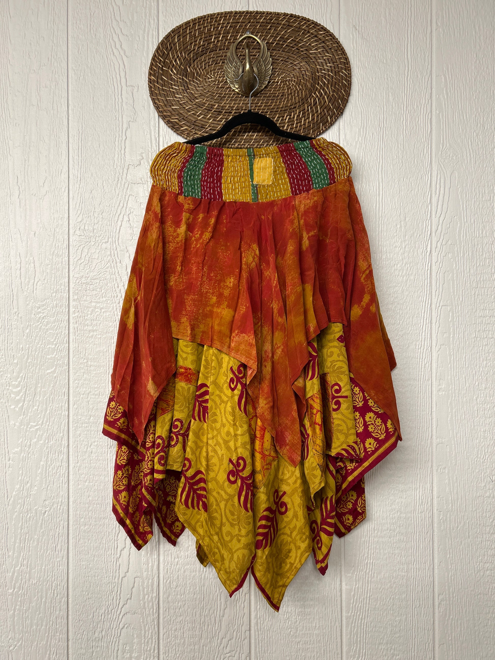 crafted from our ultra lux vintage crepe and ragulla sari. Features a rock star asymmetrical hem and stretchy pareo kantha waistband. This versatile piece can be pulled up to be worn as a tunic!