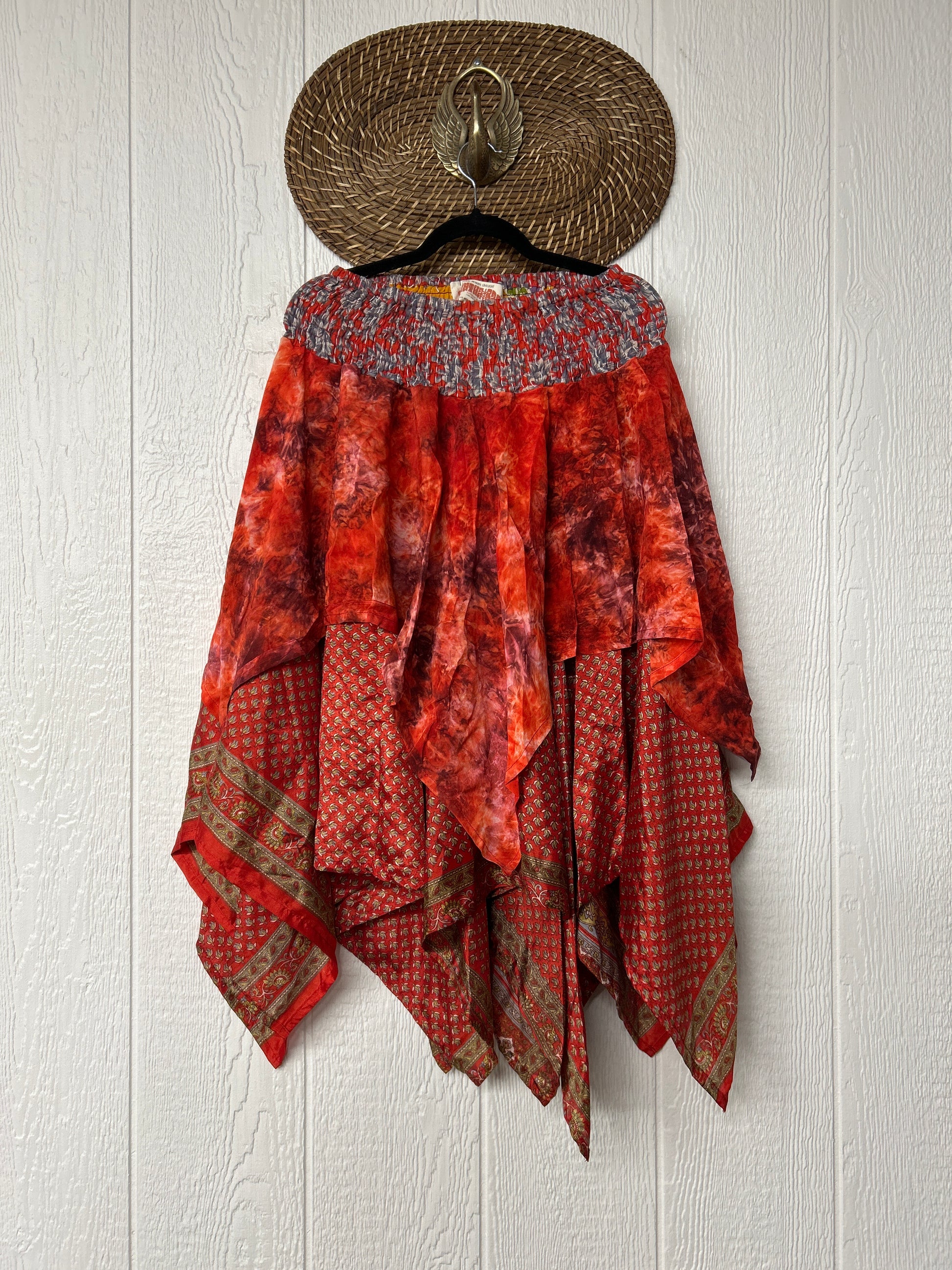 crafted from our ultra lux vintage crepe and ragulla sari. Features a rock star asymmetrical hem and stretchy pareo kantha waistband. This versatile piece can be pulled up to be worn as a tunic!