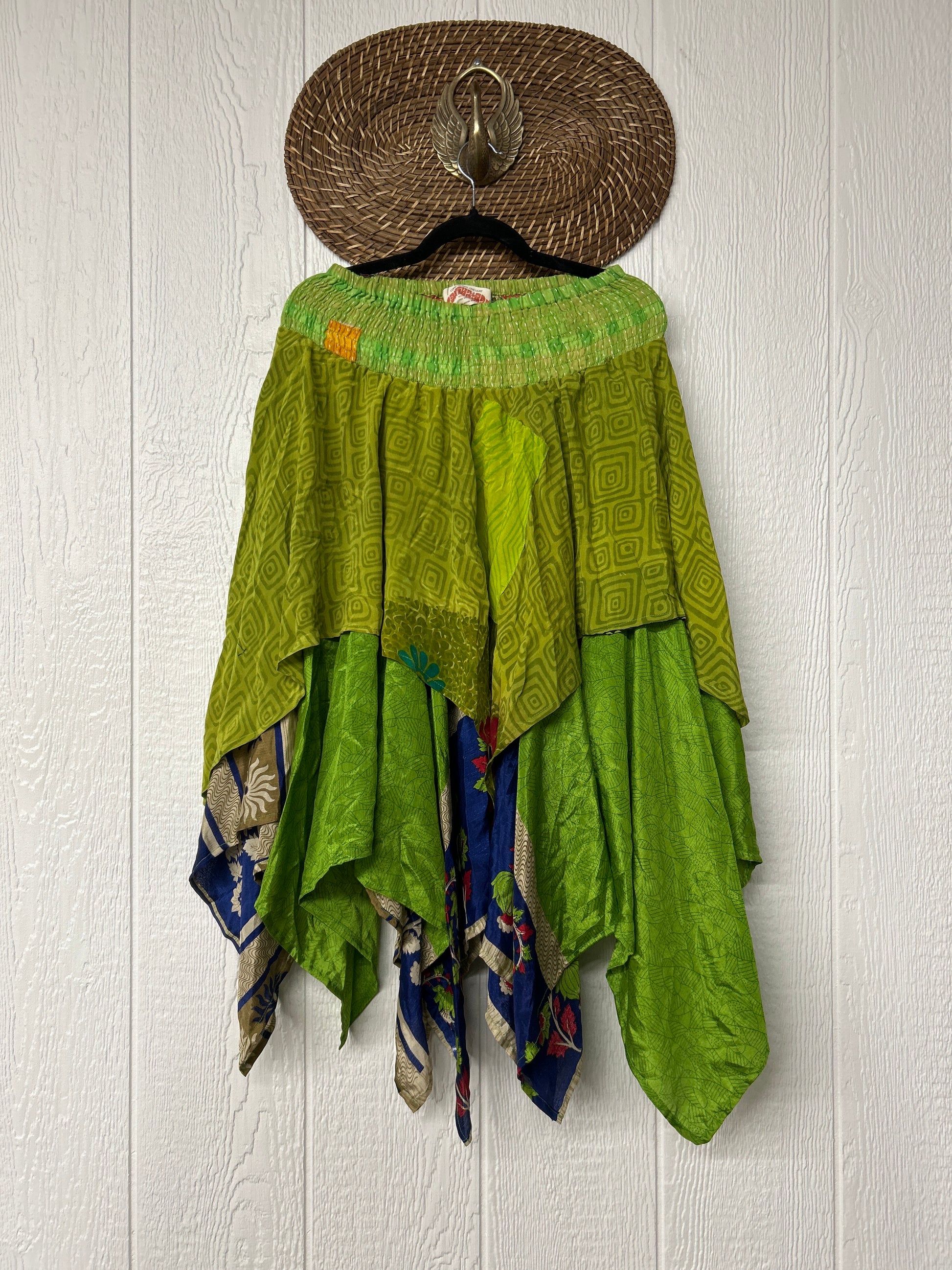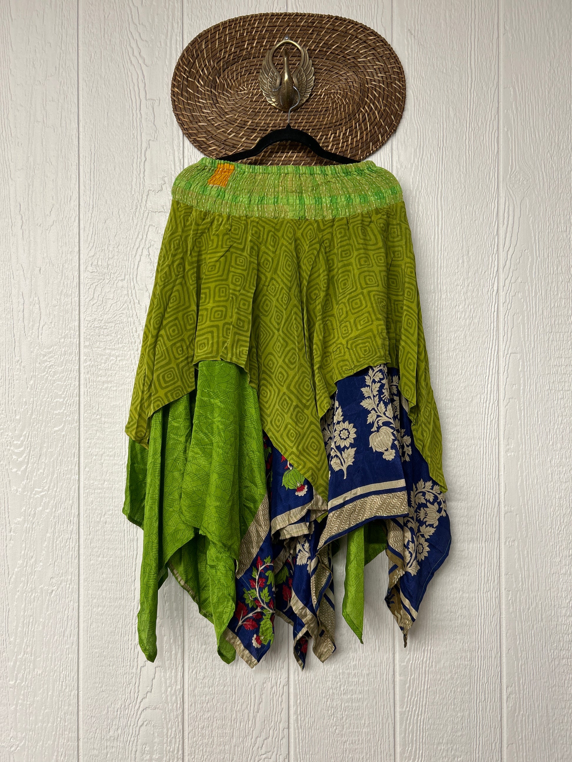 crafted from our ultra lux vintage crepe and ragulla sari. Features a rock star asymmetrical hem and stretchy pareo kantha waistband. This versatile piece can be pulled up to be worn as a tunic!